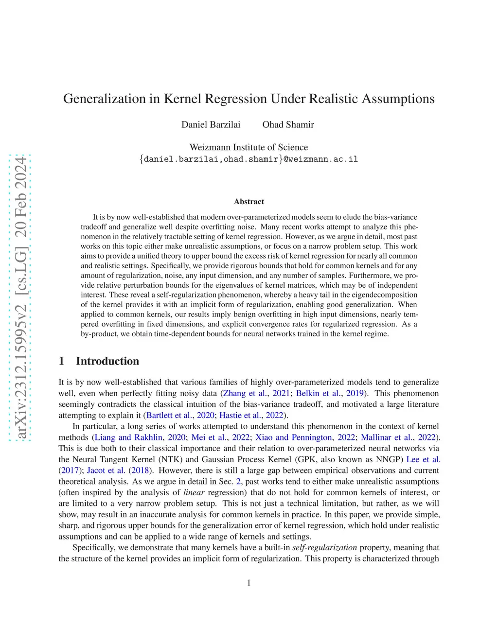 It is by now well-established that modern over-parameterized models seem to elude the bias-variance tradeoff and generalize well despite overfitting noise. Many recent works attempt to analyze this phenomenon in the relatively tractable setting of kernel regression. However, as we argue in detail, most past works on this topic either make unrealistic assumptions, or focus on a narrow problem setup. This work aims to provide a unified theory to upper bound the excess risk of kernel regression for nearly all common and realistic settings. Specifically, we provide rigorous bounds that hold for common kernels and for any amount of regularization, noise, any input dimension, and any number of samples. Furthermore, we provide relative perturbation bounds for the eigenvalues of kernel matrices, which may be of independent interest. These reveal a self-regularization phenomenon, whereby a heavy tail in the eigendecomposition of the kernel provides it with an implicit form of regularization, enabling good generalization. When applied to common kernels, our results imply benign overfitting in high input dimensions, nearly tempered overfitting in fixed dimensions, and explicit convergence rates for regularized regression. As a by-product, we obtain time-dependent bounds for neural networks trained in the kernel regime.