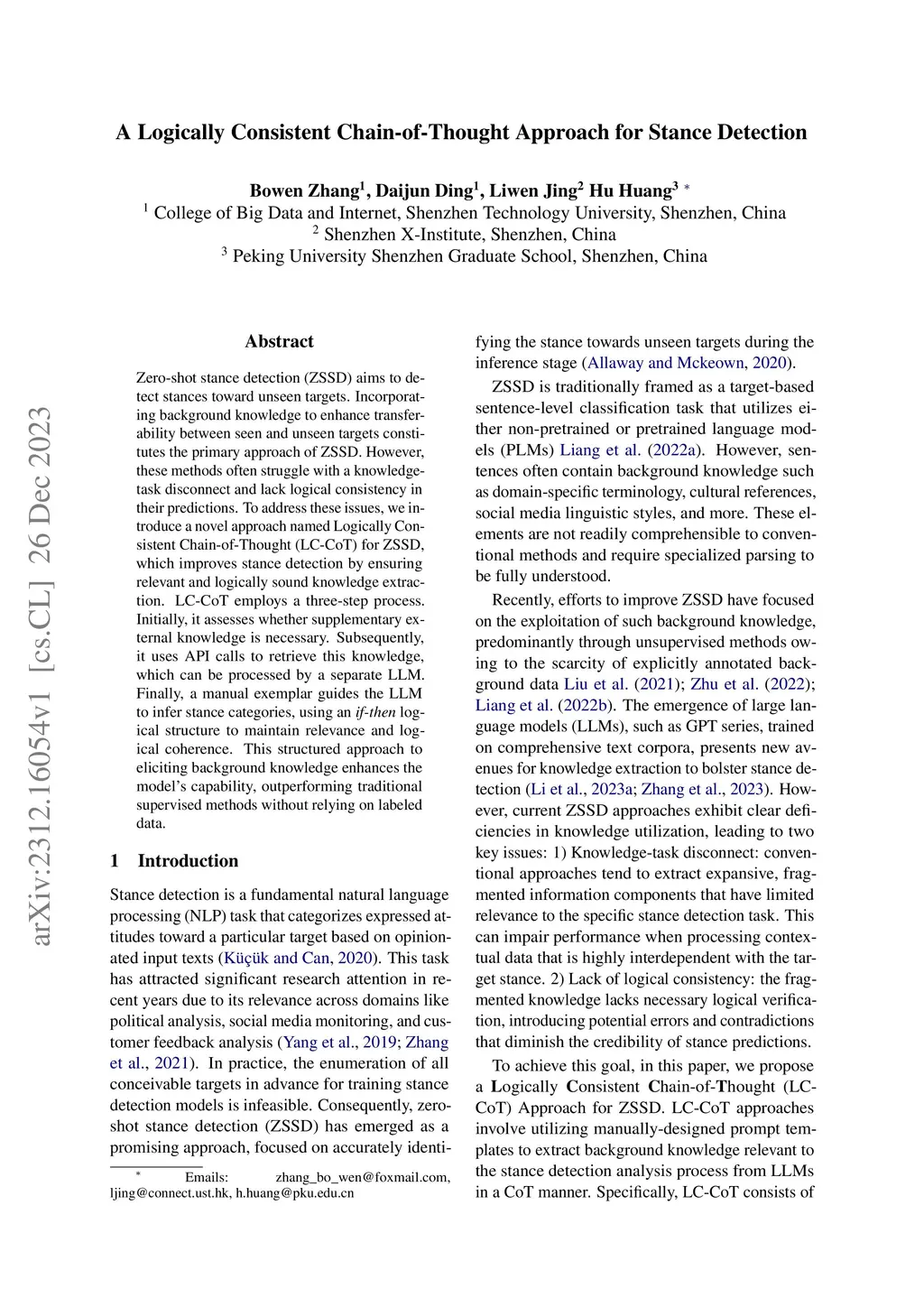 Zero-shot stance detection (ZSSD) aims to detect stances toward unseen targets. Incorporating background knowledge to enhance transferability between seen and unseen targets constitutes the primary approach of ZSSD. However, these methods often struggle with a knowledge-task disconnect and lack logical consistency in their predictions. To address these issues, we introduce a novel approach named Logically Consistent Chain-of-Thought (LC-CoT) for ZSSD, which improves stance detection by ensuring relevant and logically sound knowledge extraction. LC-CoT employs a three-step process. Initially, it assesses whether supplementary external knowledge is necessary. Subsequently, it uses API calls to retrieve this knowledge, which can be processed by a separate LLM. Finally, a manual exemplar guides the LLM to infer stance categories, using an if-then logical structure to maintain relevance and logical coherence. This structured approach to eliciting background knowledge enhances the model's capability, outperforming traditional supervised methods without relying on labeled data.