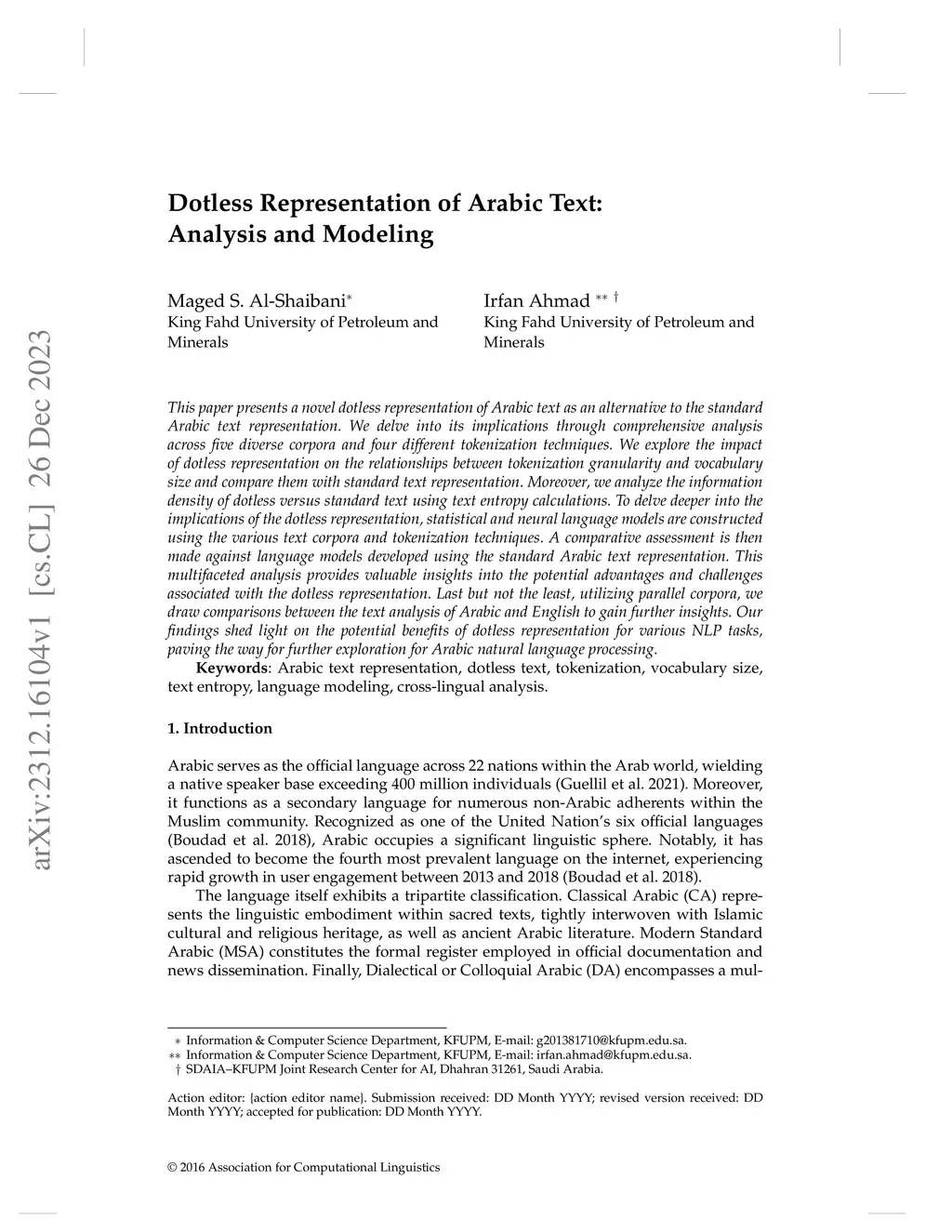 Dotless Representation of Arabic Text: Analysis and Modeling