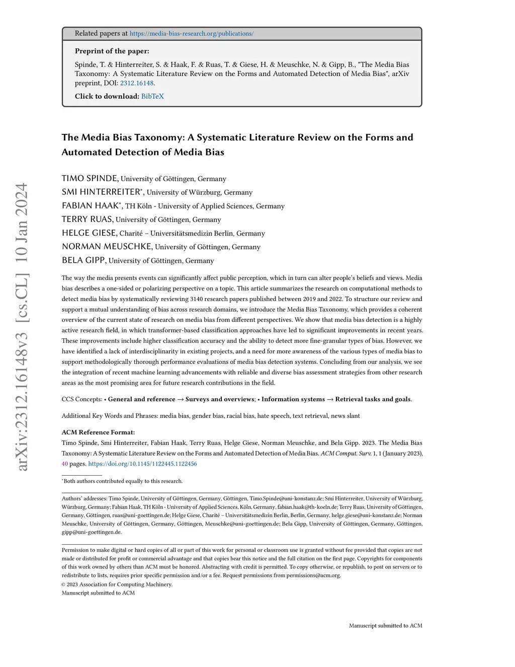 The way the media presents events can significantly affect public perception, which in turn can alter people's beliefs and views. Media bias describes a one-sided or polarizing perspective on a topic. This article summarizes the research on computational methods to detect media bias by systematically reviewing 3140 research papers published between 2019 and 2022. To structure our review and support a mutual understanding of bias across research domains, we introduce the Media Bias Taxonomy, which provides a coherent overview of the current state of research on media bias from different perspectives. We show that media bias detection is a highly active research field, in which transformer-based classification approaches have led to significant improvements in recent years. These improvements include higher classification accuracy and the ability to detect more fine-granular types of bias. However, we have identified a lack of interdisciplinarity in existing projects, and a need for more awareness of the various types of media bias to support methodologically thorough performance evaluations of media bias detection systems. Concluding from our analysis, we see the integration of recent machine learning advancements with reliable and diverse bias assessment strategies from other research areas as the most promising area for future research contributions in the field.