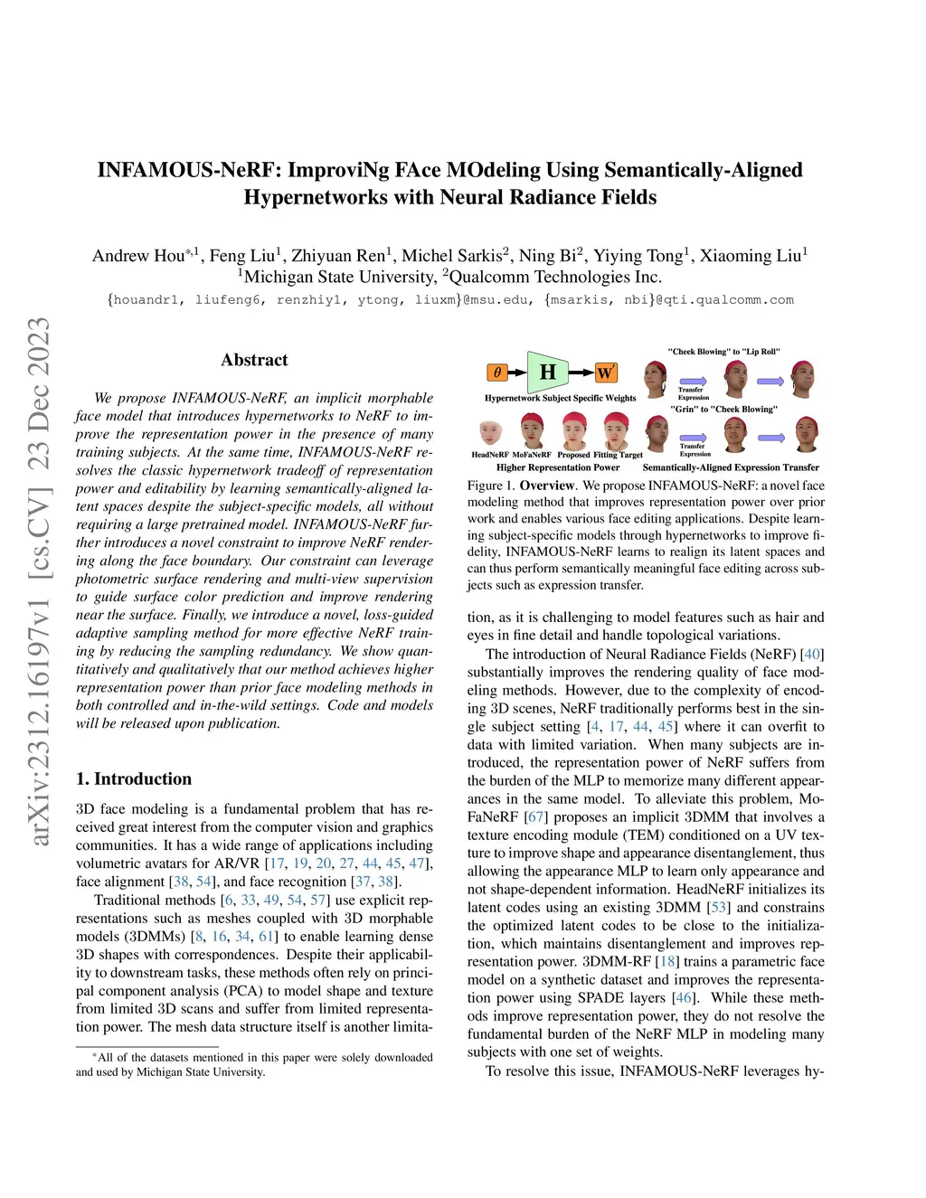 We propose INFAMOUS-NeRF, an implicit morphable face model that introduces hypernetworks to NeRF to improve the representation power in the presence of many training subjects. At the same time, INFAMOUS-NeRF resolves the classic hypernetwork tradeoff of representation power and editability by learning semantically-aligned latent spaces despite the subject-specific models, all without requiring a large pretrained model. INFAMOUS-NeRF further introduces a novel constraint to improve NeRF rendering along the face boundary. Our constraint can leverage photometric surface rendering and multi-view supervision to guide surface color prediction and improve rendering near the surface. Finally, we introduce a novel, loss-guided adaptive sampling method for more effective NeRF training by reducing the sampling redundancy. We show quantitatively and qualitatively that our method achieves higher representation power than prior face modeling methods in both controlled and in-the-wild settings. Code and models will be released upon publication.