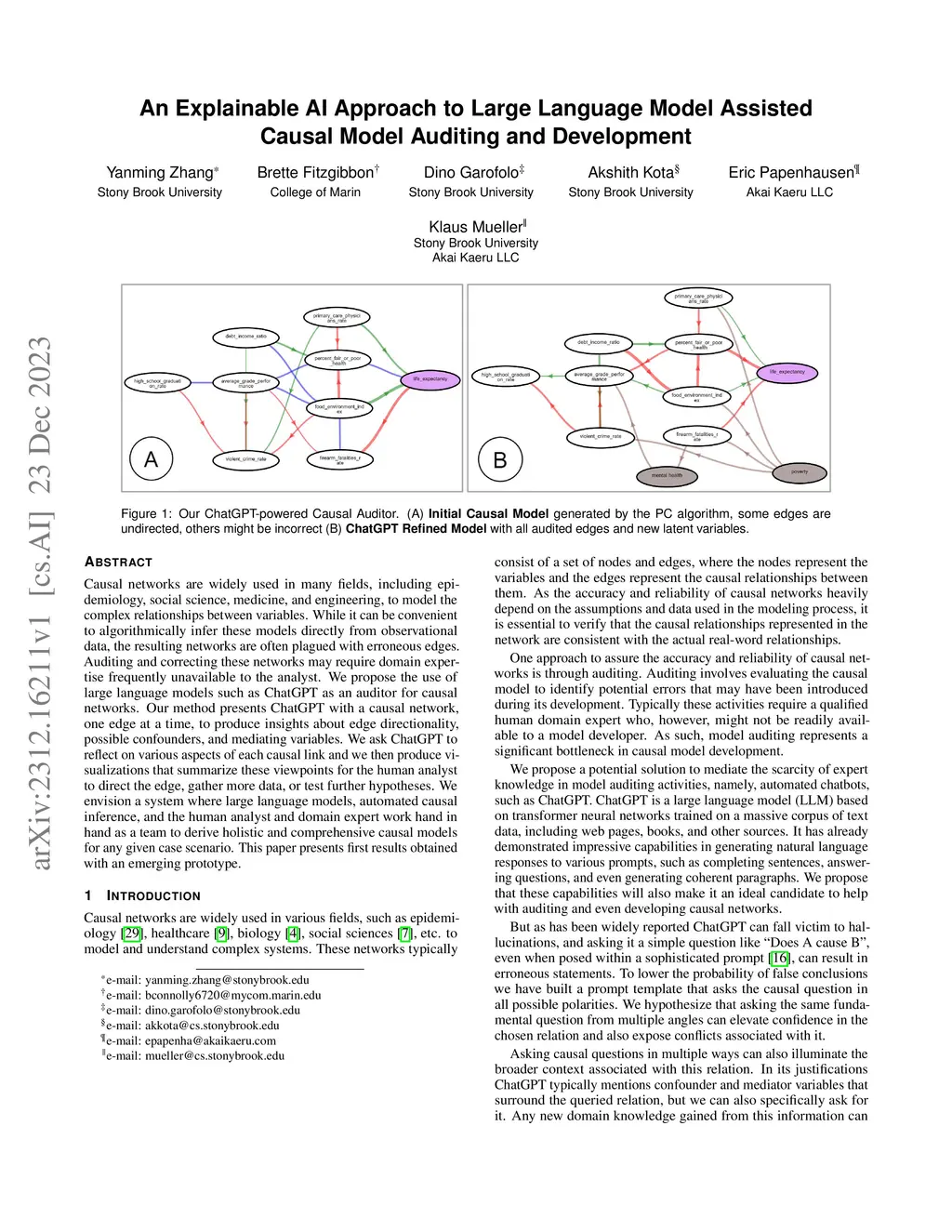 Causal networks are widely used in many fields, including epidemiology, social science, medicine, and engineering, to model the complex relationships between variables. While it can be convenient to algorithmically infer these models directly from observational data, the resulting networks are often plagued with erroneous edges. Auditing and correcting these networks may require domain expertise frequently unavailable to the analyst. We propose the use of large language models such as ChatGPT as an auditor for causal networks. Our method presents ChatGPT with a causal network, one edge at a time, to produce insights about edge directionality, possible confounders, and mediating variables. We ask ChatGPT to reflect on various aspects of each causal link and we then produce visualizations that summarize these viewpoints for the human analyst to direct the edge, gather more data, or test further hypotheses. We envision a system where large language models, automated causal inference, and the human analyst and domain expert work hand in hand as a team to derive holistic and comprehensive causal models for any given case scenario. This paper presents first results obtained with an emerging prototype.