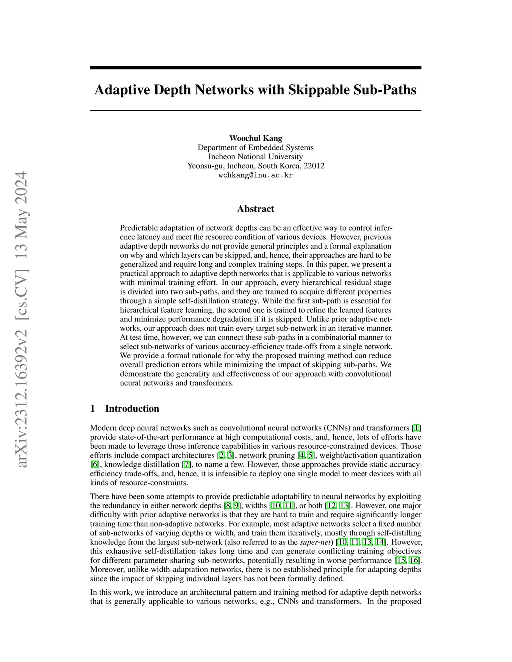 Predictable adaptation of network depths can be an effective way to control inference latency and meet the resource condition of various devices. However, previous adaptive depth networks do not provide general principles and a formal explanation on why and which layers can be skipped, and, hence, their approaches are hard to be generalized and require long and complex training steps. In this paper, we present a practical approach to adaptive depth networks that is applicable to various networks with minimal training effort. In our approach, every hierarchical residual stage is divided into two sub-paths, and they are trained to acquire different properties through a simple self-distillation strategy. While the first sub-path is essential for hierarchical feature learning, the second one is trained to refine the learned features and minimize performance degradation if it is skipped. Unlike prior adaptive networks, our approach does not train every target sub-network in an iterative manner. At test time, however, we can connect these sub-paths in a combinatorial manner to select sub-networks of various accuracy-efficiency trade-offs from a single network. We provide a formal rationale for why the proposed training method can reduce overall prediction errors while minimizing the impact of skipping sub-paths. We demonstrate the generality and effectiveness of our approach with convolutional neural networks and transformers.