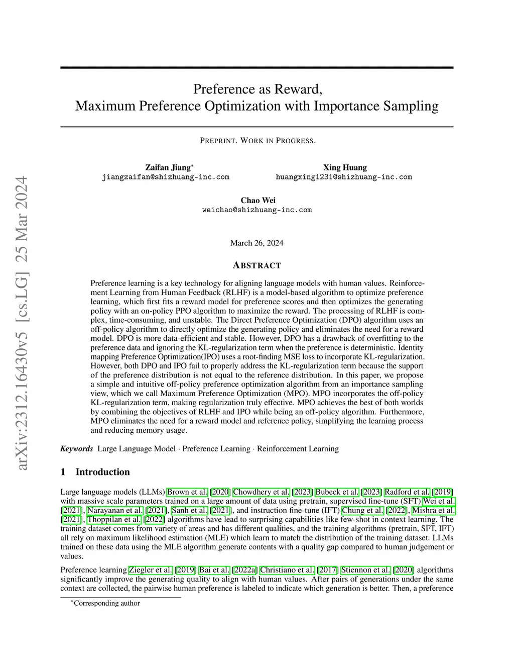 Preference learning is a key technology for aligning language models with human values. Reinforcement Learning from Human Feedback (RLHF) is a model-based algorithm to optimize preference learning, which first fits a reward model for preference scores and then optimizes the generating policy with an on-policy PPO algorithm to maximize the reward. The processing of RLHF is complex, time-consuming, and unstable. The Direct Preference Optimization (DPO) algorithm uses an off-policy algorithm to directly optimize the generating policy and eliminates the need for a reward model. DPO is more data-efficient and stable. However, DPO has a drawback of overfitting to the preference data and ignoring the KL-regularization term when the preference is deterministic. Identity mapping Preference Optimization(IPO) uses a root-finding MSE loss to incorporate KL-regularization. However, both DPO and IPO fail to properly address the KL-regularization term because the support of the preference distribution is not equal to the reference distribution. In this paper, we propose a simple and intuitive off-policy preference optimization algorithm from an importance sampling view, which we call Maximum Preference Optimization (MPO). MPO incorporates the off-policy KL-regularization term, making regularization truly effective. MPO achieves the best of both worlds by combining the objectives of RLHF and IPO while being an off-policy algorithm. Furthermore, MPO eliminates the need for a reward model and reference policy, simplifying the learning process and reducing memory usage.