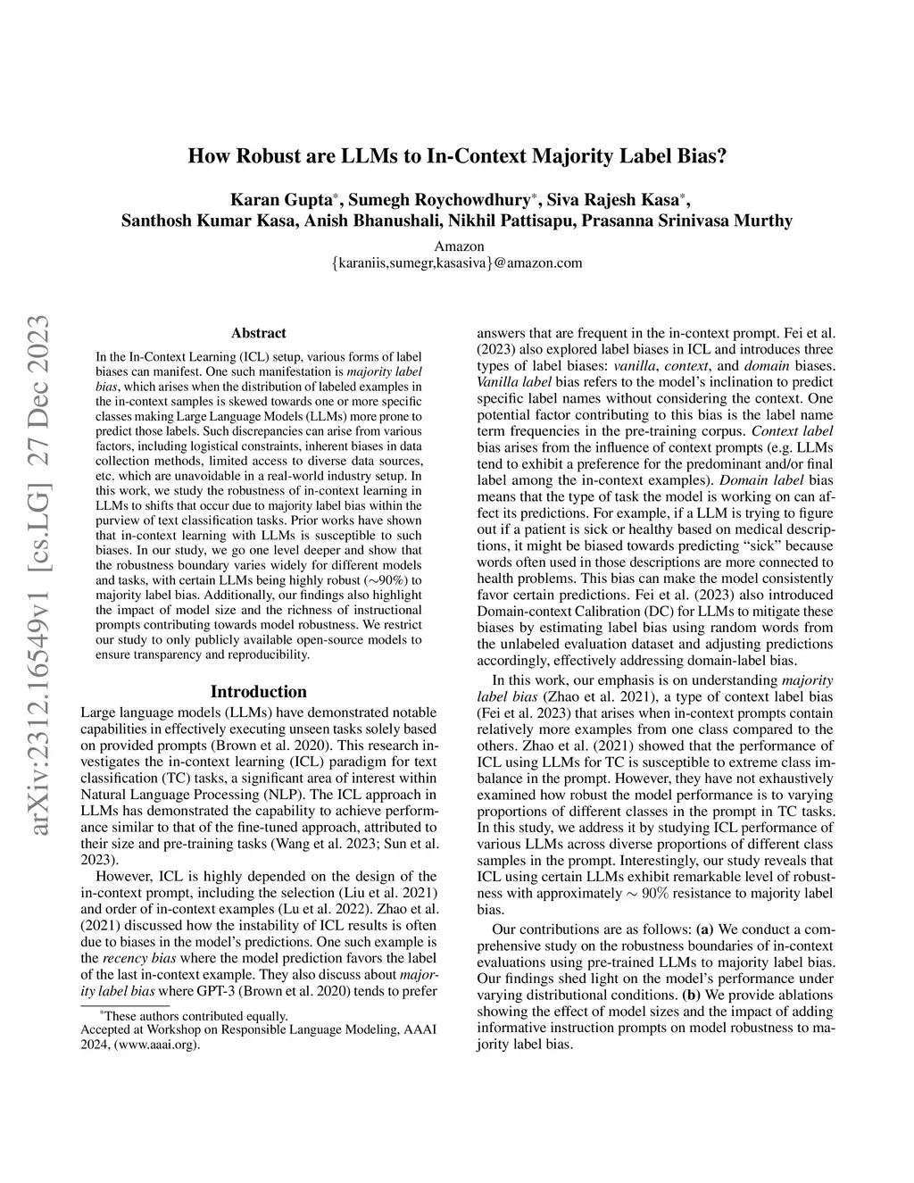 In the In-Context Learning (ICL) setup, various forms of label biases can manifest. One such manifestation is majority label bias, which arises when the distribution of labeled examples in the in-context samples is skewed towards one or more specific classes making Large Language Models (LLMs) more prone to predict those labels. Such discrepancies can arise from various factors, including logistical constraints, inherent biases in data collection methods, limited access to diverse data sources, etc. which are unavoidable in a real-world industry setup. In this work, we study the robustness of in-context learning in LLMs to shifts that occur due to majority label bias within the purview of text classification tasks. Prior works have shown that in-context learning with LLMs is susceptible to such biases. In our study, we go one level deeper and show that the robustness boundary varies widely for different models and tasks, with certain LLMs being highly robust (~90%) to majority label bias. Additionally, our findings also highlight the impact of model size and the richness of instructional prompts contributing towards model robustness. We restrict our study to only publicly available open-source models to ensure transparency and reproducibility.