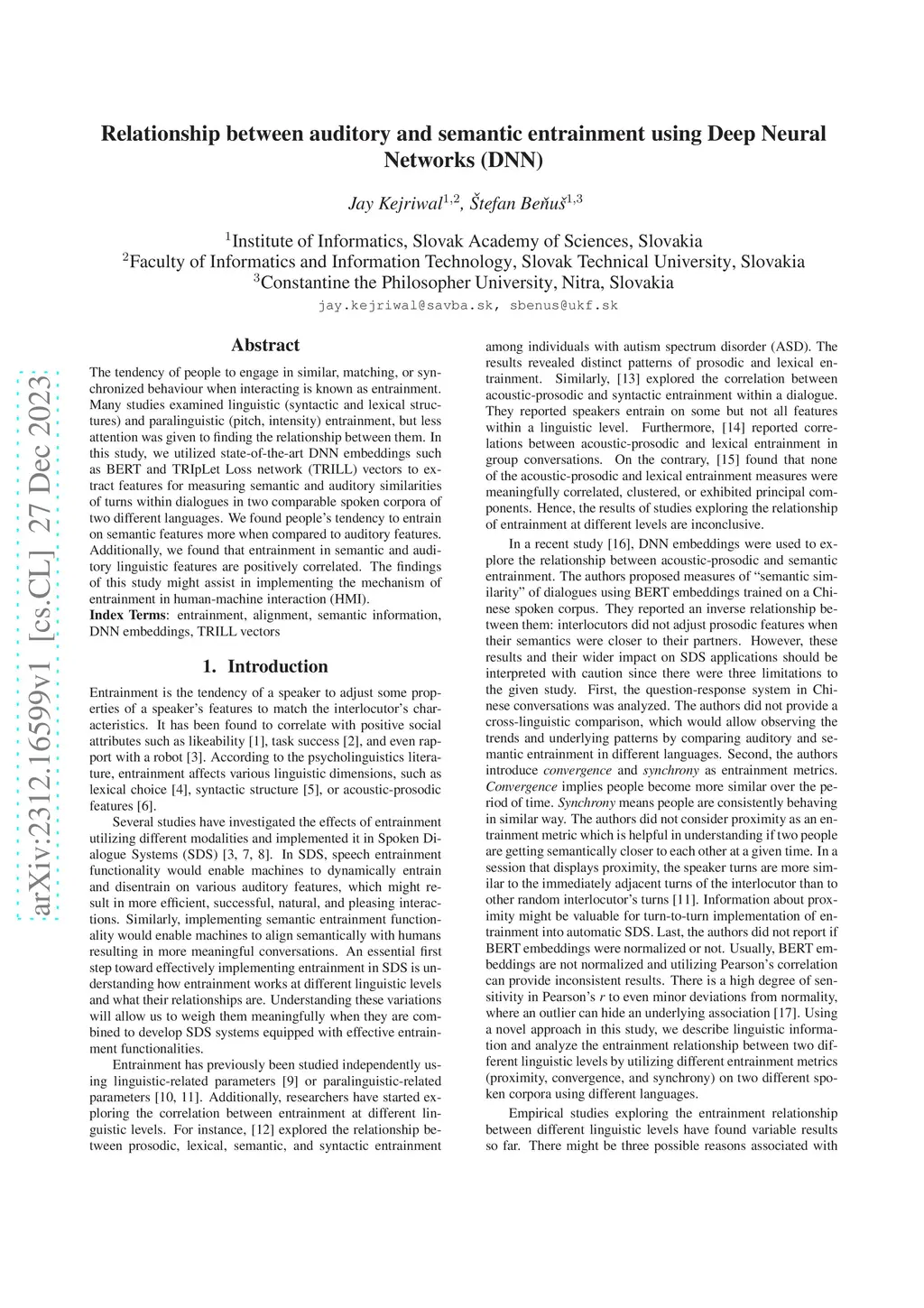 The tendency of people to engage in similar, matching, or synchronized behaviour when interacting is known as entrainment. Many studies examined linguistic (syntactic and lexical structures) and paralinguistic (pitch, intensity) entrainment, but less attention was given to finding the relationship between them. In this study, we utilized state-of-the-art DNN embeddings such as BERT and TRIpLet Loss network (TRILL) vectors to extract features for measuring semantic and auditory similarities of turns within dialogues in two comparable spoken corpora of two different languages. We found people's tendency to entrain on semantic features more when compared to auditory features. Additionally, we found that entrainment in semantic and auditory linguistic features are positively correlated. The findings of this study might assist in implementing the mechanism of entrainment in human-machine interaction (HMI).