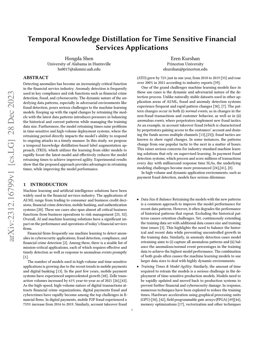 Detecting anomalies has become an increasingly critical function in the financial service industry. Anomaly detection is frequently used in key compliance and risk functions such as financial crime detection fraud and cybersecurity. The dynamic nature of the underlying data patterns especially in adversarial environments like fraud detection poses serious challenges to the machine learning models. Keeping up with the rapid changes by retraining the models with the latest data patterns introduces pressures in balancing the historical and current patterns while managing the training data size. Furthermore the model retraining times raise problems in time-sensitive and high-volume deployment systems where the retraining period directly impacts the models ability to respond to ongoing attacks in a timely manner. In this study we propose a temporal knowledge distillation-based label augmentation approach (TKD) which utilizes the learning from older models to rapidly boost the latest model and effectively reduces the model retraining times to achieve improved agility. Experimental results show that the proposed approach provides advantages in retraining times while improving the model performance.