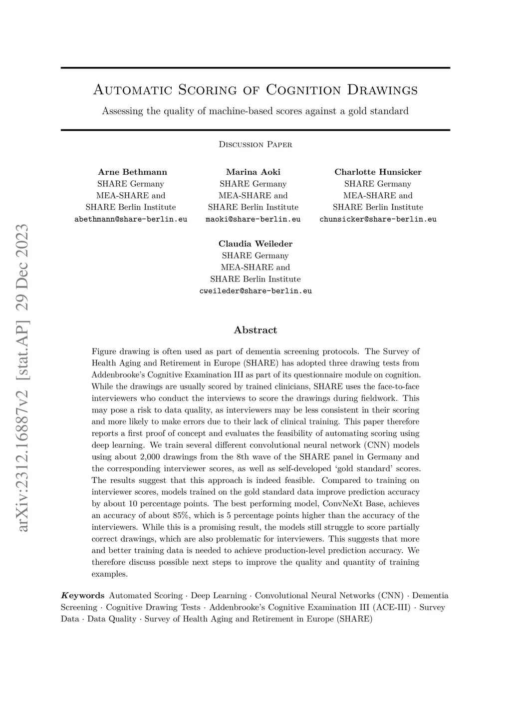 Figure drawing is often used as part of dementia screening protocols. The Survey of Health Aging and Retirement in Europe (SHARE) has adopted three drawing tests from Addenbrooke's Cognitive Examination III as part of its questionnaire module on cognition. While the drawings are usually scored by trained clinicians, SHARE uses the face-to-face interviewers who conduct the interviews to score the drawings during fieldwork. This may pose a risk to data quality, as interviewers may be less consistent in their scoring and more likely to make errors due to their lack of clinical training. This paper therefore reports a first proof of concept and evaluates the feasibility of automating scoring using deep learning. We train several different convolutional neural network (CNN) models using about 2,000 drawings from the 8th wave of the SHARE panel in Germany and the corresponding interviewer scores, as well as self-developed 'gold standard' scores. The results suggest that this approach is indeed feasible. Compared to training on interviewer scores, models trained on the gold standard data improve prediction accuracy by about 10 percentage points. The best performing model, ConvNeXt Base, achieves an accuracy of about 85%, which is 5 percentage points higher than the accuracy of the interviewers. While this is a promising result, the models still struggle to score partially correct drawings, which are also problematic for interviewers. This suggests that more and better training data is needed to achieve production-level prediction accuracy. We therefore discuss possible next steps to improve the quality and quantity of training examples.