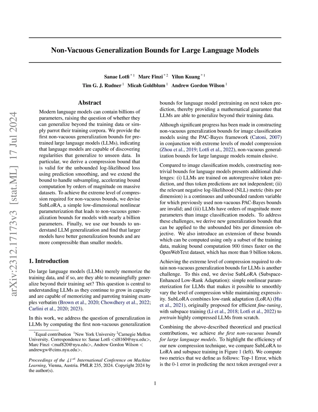 Modern language models can contain billions of parameters, raising the question of whether they can generalize beyond the training data or simply parrot their training corpora. We provide the first non-vacuous generalization bounds for pretrained large language models (LLMs), indicating that language models are capable of discovering regularities that generalize to unseen data. In particular, we derive a compression bound that is valid for the unbounded log-likelihood loss using prediction smoothing, and we extend the bound to handle subsampling, accelerating bound computation by orders of magnitude on massive datasets. To achieve the extreme level of compression required for non-vacuous bounds, we devise SubLoRA, a simple low-dimensional nonlinear parameterization that leads to non-vacuous generalization bounds for models with nearly a billion parameters. Finally, we use our bounds to understand LLM generalization and find that larger models have better generalization bounds and are more compressible than smaller models.