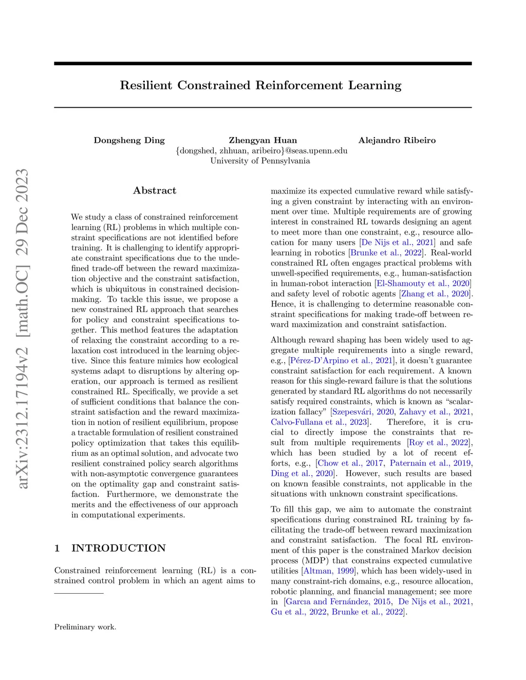 We study a class of constrained reinforcement learning (RL) problems in which multiple constraint specifications are not identified before training. It is challenging to identify appropriate constraint specifications due to the undefined trade-off between the reward maximization objective and the constraint satisfaction, which is ubiquitous in constrained decision-making. To tackle this issue, we propose a new constrained RL approach that searches for policy and constraint specifications together. This method features the adaptation of relaxing the constraint according to a relaxation cost introduced in the learning objective. Since this feature mimics how ecological systems adapt to disruptions by altering operation, our approach is termed as resilient constrained RL. Specifically, we provide a set of sufficient conditions that balance the constraint satisfaction and the reward maximization in notion of resilient equilibrium, propose a tractable formulation of resilient constrained policy optimization that takes this equilibrium as an optimal solution, and advocate two resilient constrained policy search algorithms with non-asymptotic convergence guarantees on the optimality gap and constraint satisfaction. Furthermore, we demonstrate the merits and the effectiveness of our approach in computational experiments.