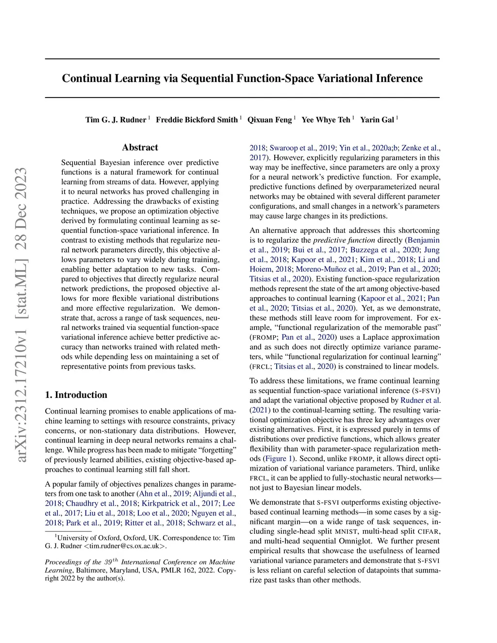 Sequential Bayesian inference over predictive functions is a natural framework for continual learning from streams of data. However, applying it to neural networks has proved challenging in practice. Addressing the drawbacks of existing techniques, we propose an optimization objective derived by formulating continual learning as sequential function-space variational inference. In contrast to existing methods that regularize neural network parameters directly, this objective allows parameters to vary widely during training, enabling better adaptation to new tasks. Compared to objectives that directly regularize neural network predictions, the proposed objective allows for more flexible variational distributions and more effective regularization. We demonstrate that, across a range of task sequences, neural networks trained via sequential function-space variational inference achieve better predictive accuracy than networks trained with related methods while depending less on maintaining a set of representative points from previous tasks.