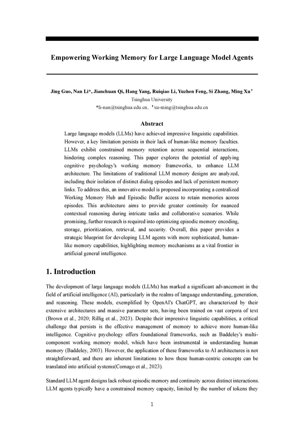 Large language models (LLMs) have achieved impressive linguistic capabilities. However, a key limitation persists in their lack of human-like memory faculties. LLMs exhibit constrained memory retention across sequential interactions, hindering complex reasoning. This paper explores the potential of applying cognitive psychology's working memory frameworks, to enhance LLM architecture. The limitations of traditional LLM memory designs are analyzed, including their isolation of distinct dialog episodes and lack of persistent memory links. To address this, an innovative model is proposed incorporating a centralized Working Memory Hub and Episodic Buffer access to retain memories across episodes. This architecture aims to provide greater continuity for nuanced contextual reasoning during intricate tasks and collaborative scenarios. While promising, further research is required into optimizing episodic memory encoding, storage, prioritization, retrieval, and security. Overall, this paper provides a strategic blueprint for developing LLM agents with more sophisticated, human-like memory capabilities, highlighting memory mechanisms as a vital frontier in artificial general intelligence.