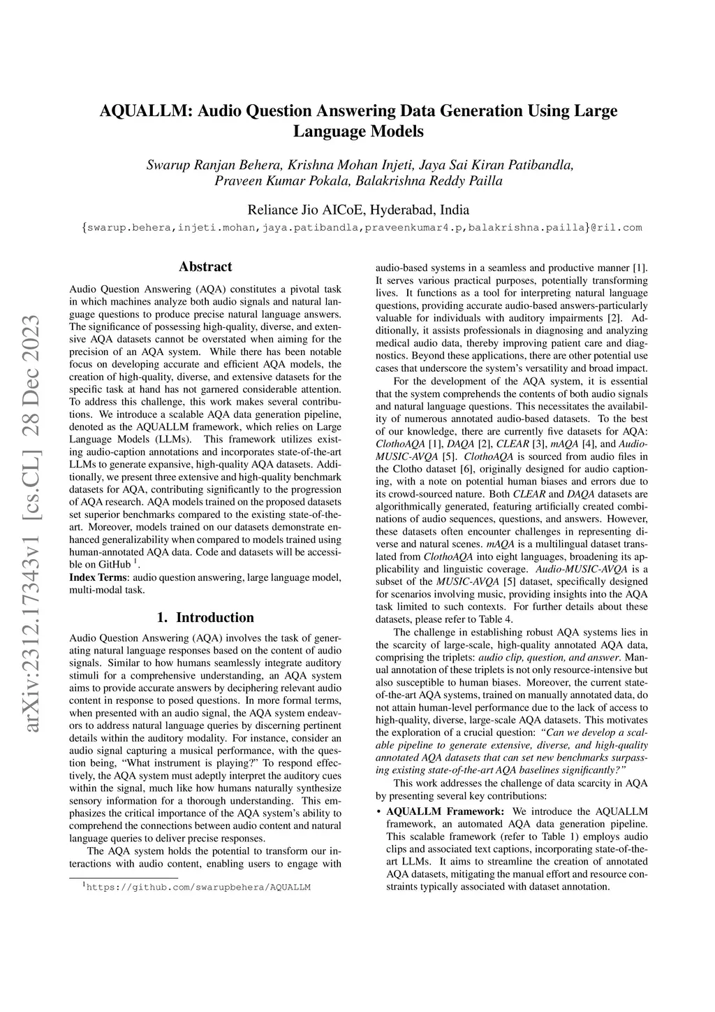 Audio Question Answering (AQA) constitutes a pivotal task in which machines analyze both audio signals and natural language questions to produce precise natural language answers. The significance of possessing high-quality, diverse, and extensive AQA datasets cannot be overstated when aiming for the precision of an AQA system. While there has been notable focus on developing accurate and efficient AQA models, the creation of high-quality, diverse, and extensive datasets for the specific task at hand has not garnered considerable attention. To address this challenge, this work makes several contributions. We introduce a scalable AQA data generation pipeline, denoted as the AQUALLM framework, which relies on Large Language Models (LLMs). This framework utilizes existing audio-caption annotations and incorporates state-of-the-art LLMs to generate expansive, high-quality AQA datasets. Additionally, we present three extensive and high-quality benchmark datasets for AQA, contributing significantly to the progression of AQA research. AQA models trained on the proposed datasets set superior benchmarks compared to the existing state-of-the-art. Moreover, models trained on our datasets demonstrate enhanced generalizability when compared to models trained using human-annotated AQA data. Code and datasets will be accessible on GitHub~\footnote{\url{https://github.com/swarupbehera/AQUALLM}}.