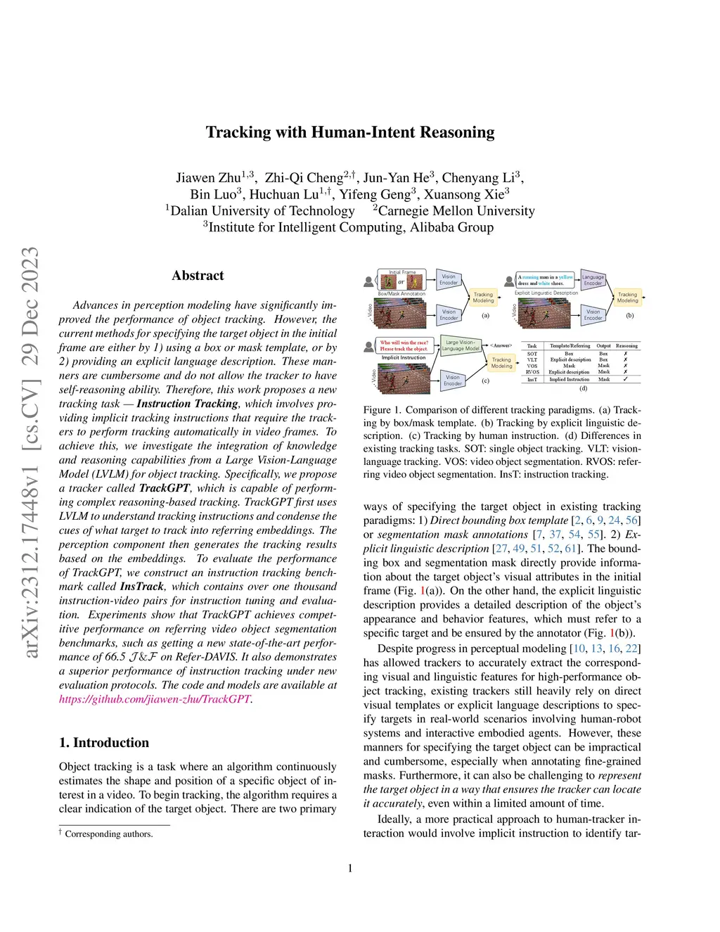 Advances in perception modeling have significantly improved the performance of object tracking. However, the current methods for specifying the target object in the initial frame are either by 1) using a box or mask template, or by 2) providing an explicit language description. These manners are cumbersome and do not allow the tracker to have self-reasoning ability. Therefore, this work proposes a new tracking task -- Instruction Tracking, which involves providing implicit tracking instructions that require the trackers to perform tracking automatically in video frames. To achieve this, we investigate the integration of knowledge and reasoning capabilities from a Large Vision-Language Model (LVLM) for object tracking. Specifically, we propose a tracker called TrackGPT, which is capable of performing complex reasoning-based tracking. TrackGPT first uses LVLM to understand tracking instructions and condense the cues of what target to track into referring embeddings. The perception component then generates the tracking results based on the embeddings. To evaluate the performance of TrackGPT, we construct an instruction tracking benchmark called InsTrack, which contains over one thousand instruction-video pairs for instruction tuning and evaluation. Experiments show that TrackGPT achieves competitive performance on referring video object segmentation benchmarks, such as getting a new state-of the-art performance of 66.5 on Refer-DAVIS. It also demonstrates a superior performance of instruction tracking under new evaluation protocols. The code and models are available at \href{https://github.com/jiawen-zhu/TrackGPT}{https://github.com/jiawen-zhu/TrackGPT}.