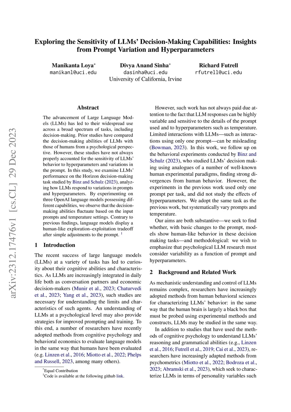 The advancement of Large Language Models (LLMs) has led to their widespread use across a broad spectrum of tasks including decision making. Prior studies have compared the decision making abilities of LLMs with those of humans from a psychological perspective. However, these studies have not always properly accounted for the sensitivity of LLMs' behavior to hyperparameters and variations in the prompt. In this study, we examine LLMs' performance on the Horizon decision making task studied by Binz and Schulz (2023) analyzing how LLMs respond to variations in prompts and hyperparameters. By experimenting on three OpenAI language models possessing different capabilities, we observe that the decision making abilities fluctuate based on the input prompts and temperature settings. Contrary to previous findings language models display a human-like exploration exploitation tradeoff after simple adjustments to the prompt.