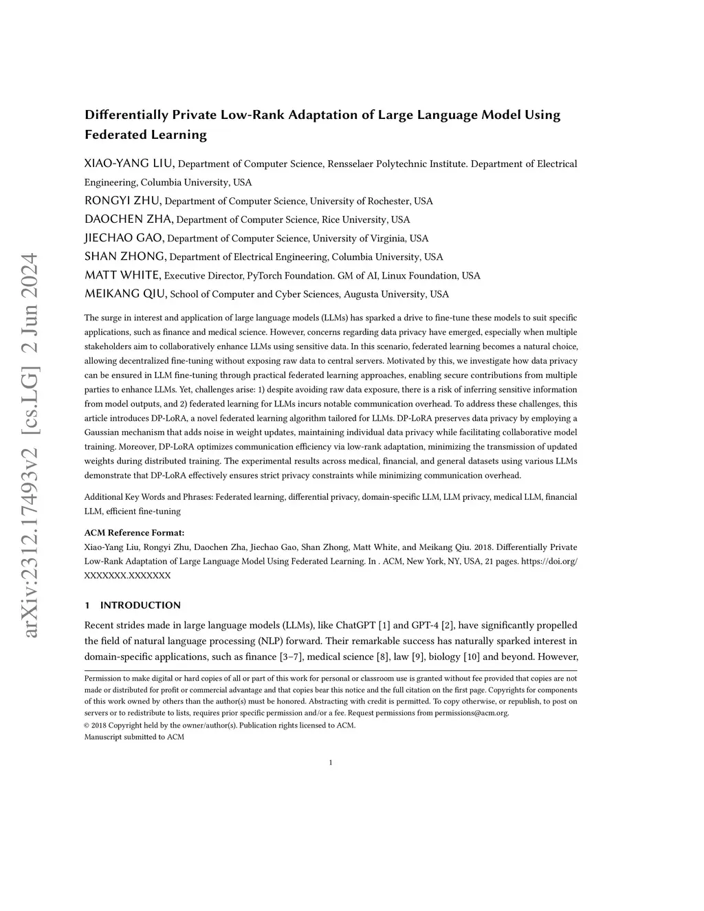The surge in interest and application of large language models (LLMs) has sparked a drive to fine-tune these models to suit specific applications, such as finance and medical science. However, concerns regarding data privacy have emerged, especially when multiple stakeholders aim to collaboratively enhance LLMs using sensitive data. In this scenario, federated learning becomes a natural choice, allowing decentralized fine-tuning without exposing raw data to central servers. Motivated by this, we investigate how data privacy can be ensured in LLM fine-tuning through practical federated learning approaches, enabling secure contributions from multiple parties to enhance LLMs. Yet, challenges arise: 1) despite avoiding raw data exposure, there is a risk of inferring sensitive information from model outputs, and 2) federated learning for LLMs incurs notable communication overhead. To address these challenges, this article introduces DP-LoRA, a novel federated learning algorithm tailored for LLMs. DP-LoRA preserves data privacy by employing a Gaussian mechanism that adds noise in weight updates, maintaining individual data privacy while facilitating collaborative model training. Moreover, DP-LoRA optimizes communication efficiency via low-rank adaptation, minimizing the transmission of updated weights during distributed training. The experimental results across medical, financial, and general datasets using various LLMs demonstrate that DP-LoRA effectively ensures strict privacy constraints while minimizing communication overhead.
