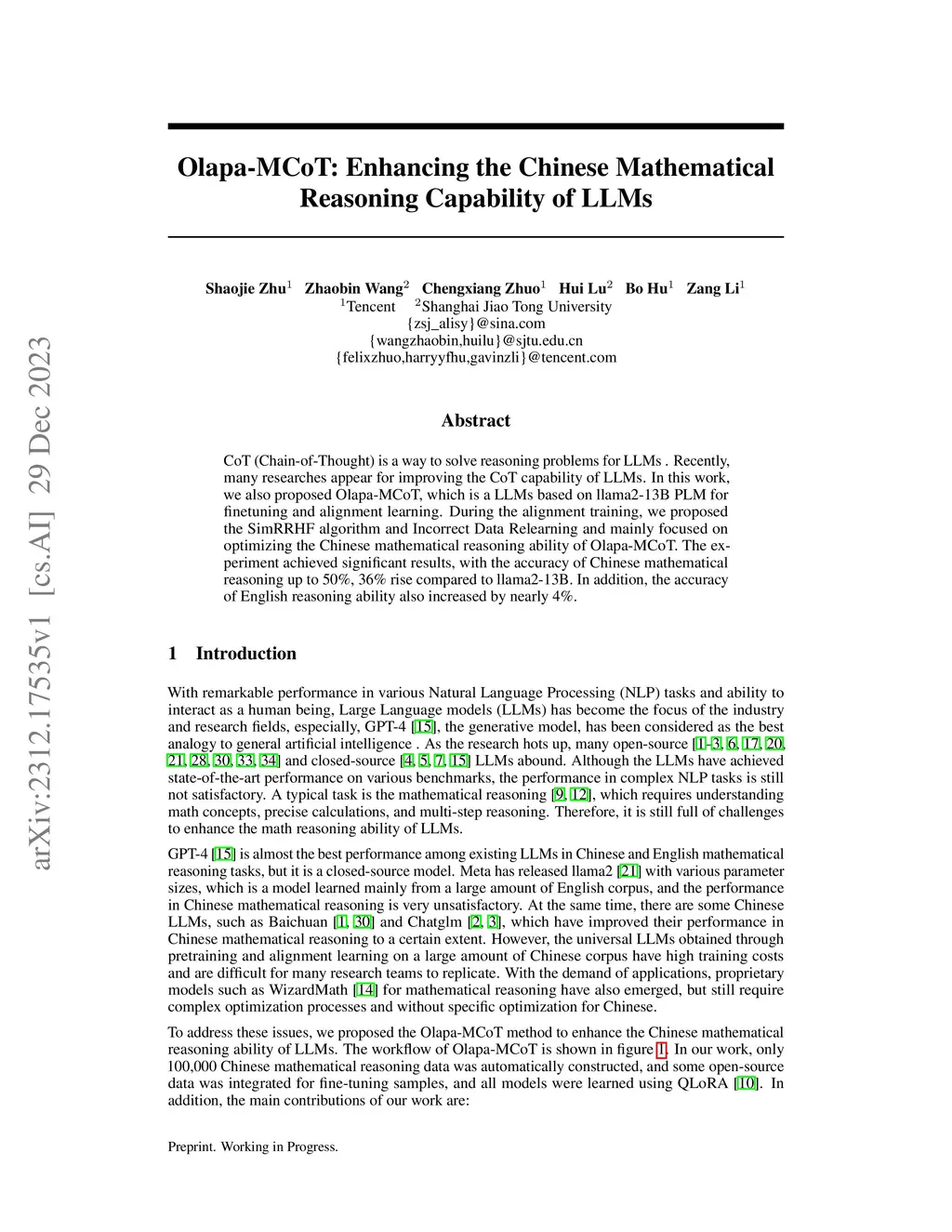 CoT (Chain-of-Thought) is a way to solve reasoning problems for LLMs . Recently, many researches appear for improving the CoT capability of LLMs. In this work, we also proposed Olapa-MCoT, which is a LLMs based on llama2-13B PLM for finetuning and alignment learning. During the alignment training, we proposed the SimRRHF algorithm and Incorrect Data Relearning and mainly focused on optimizing the Chinese mathematical reasoning ability of Olapa-MCoT. The experiment achieved significant results, with the accuracy of Chinese mathematical reasoning up to 50%, 36% rise compared to llama2-13B. In addition, the accuracy of English reasoning ability also increased by nearly 4%.
