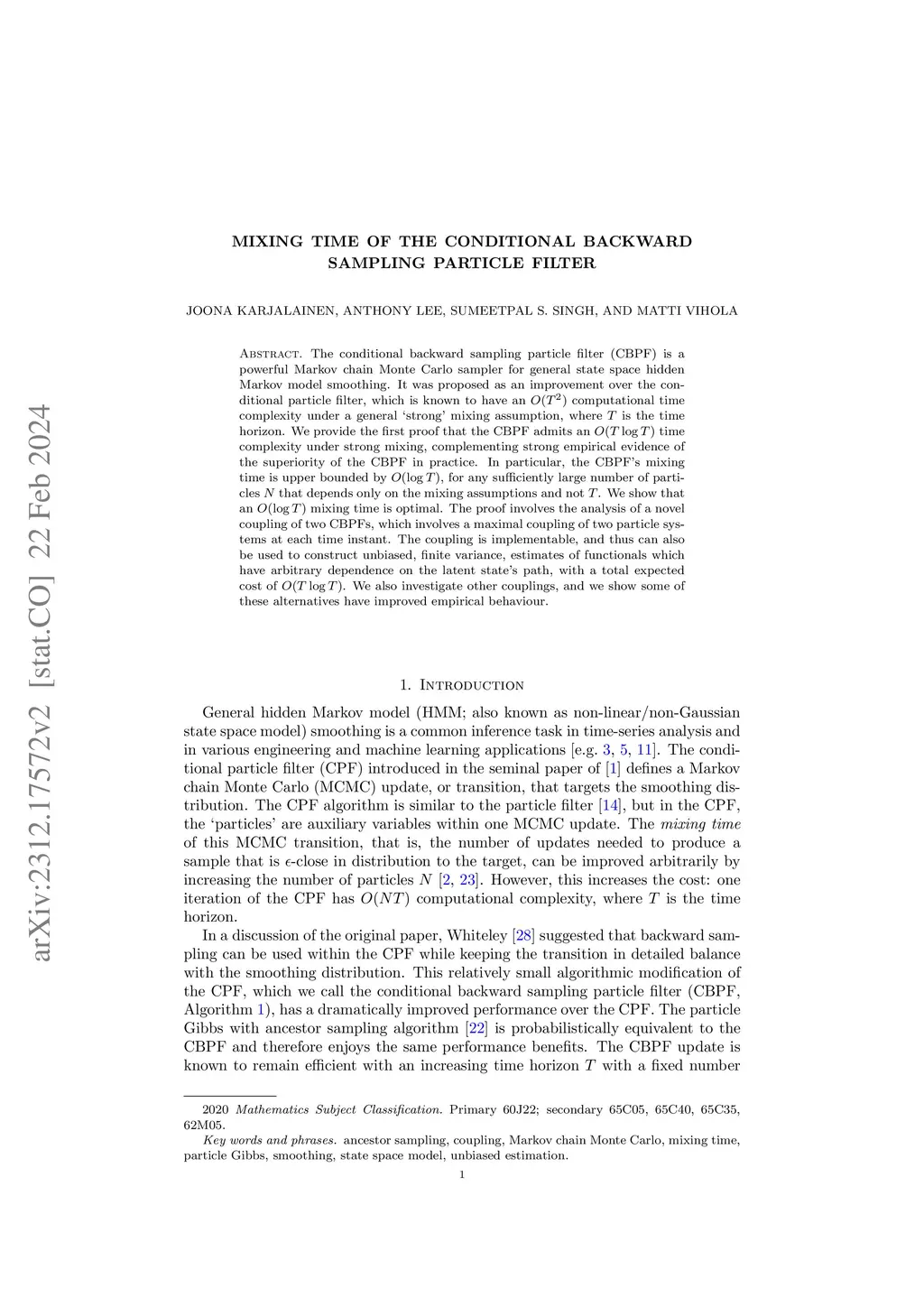 The conditional backward sampling particle filter (CBPF) is a powerful Markov chain Monte Carlo sampler for general state space hidden Markov model smoothing. It was proposed as an improvement over the conditional particle filter, which is known to have an computational time complexity under a general `strong' mixing assumption, where is the time horizon. We provide the first proof that the CBPF admits an time complexity under strong mixing, complementing strong empirical evidence of the superiority of the CBPF in practice. In particular, the CBPF's mixing time is upper bounded by , for any sufficiently large number of particles that depends only on the mixing assumptions and not . We show that an mixing time is optimal. The proof involves the analysis of a novel coupling of two CBPFs, which involves a maximal coupling of two particle systems at each time instant. The coupling is implementable, and thus can also be used to construct unbiased, finite variance, estimates of functionals which have arbitrary dependence on the latent state's path, with a total expected cost of . We also investigate other couplings, and we show some of these alternatives have improved empirical behaviour.