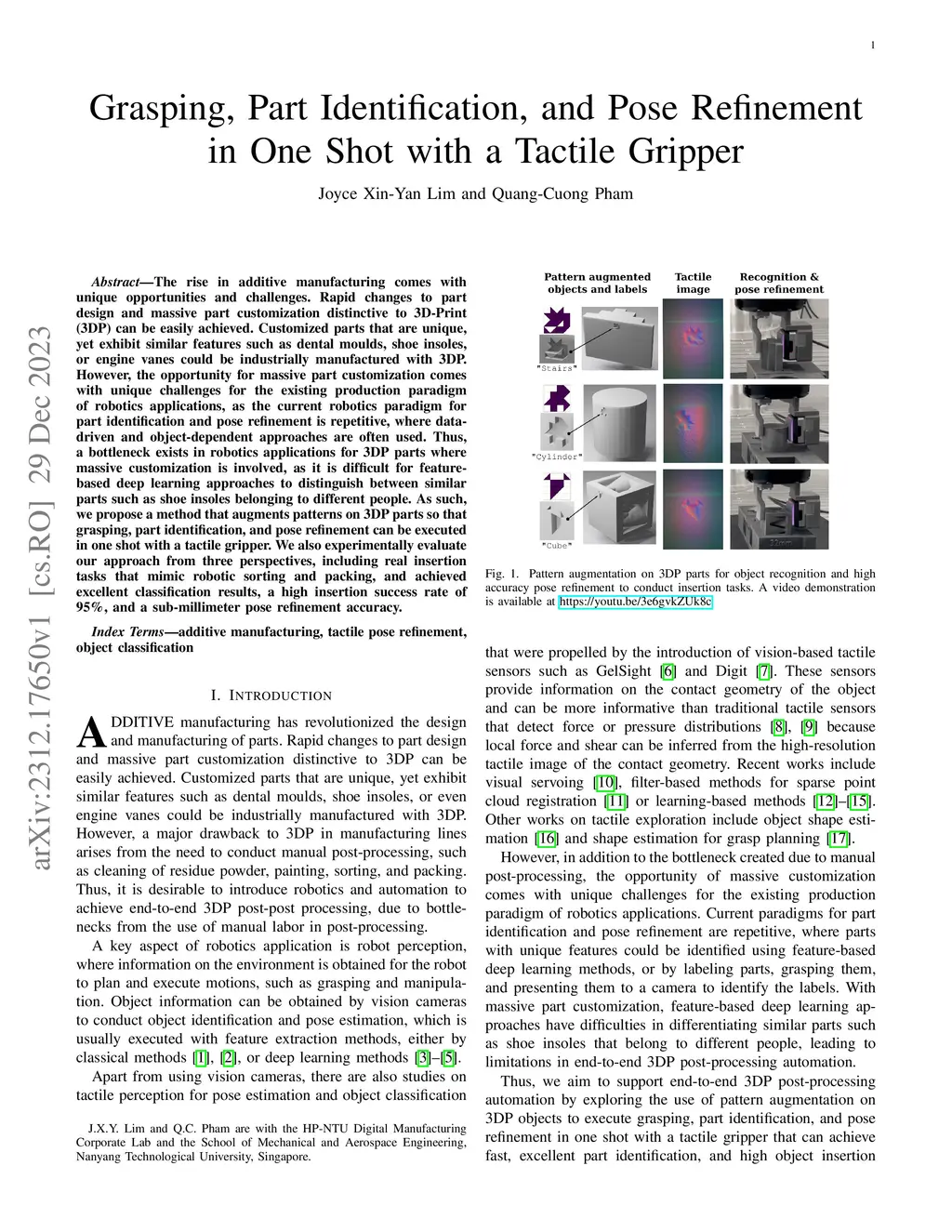 The rise in additive manufacturing comes with unique opportunities and challenges. Rapid changes to part design and massive part customization distinctive to 3D-Print (3DP) can be easily achieved. Customized parts that are unique, yet exhibit similar features such as dental moulds, shoe insoles, or engine vanes could be industrially manufactured with 3DP. However, the opportunity for massive part customization comes with unique challenges for the existing production paradigm of robotics applications, as the current robotics paradigm for part identification and pose refinement is repetitive, where data-driven and object-dependent approaches are often used. Thus, a bottleneck exists in robotics applications for 3DP parts where massive customization is involved, as it is difficult for feature-based deep learning approaches to distinguish between similar parts such as shoe insoles belonging to different people. As such, we propose a method that augments patterns on 3DP parts so that grasping, part identification, and pose refinement can be executed in one shot with a tactile gripper. We also experimentally evaluate our approach from three perspectives, including real insertion tasks that mimic robotic sorting and packing, and achieved excellent classification results, a high insertion success rate of 95%, and a sub-millimeter pose refinement accuracy.