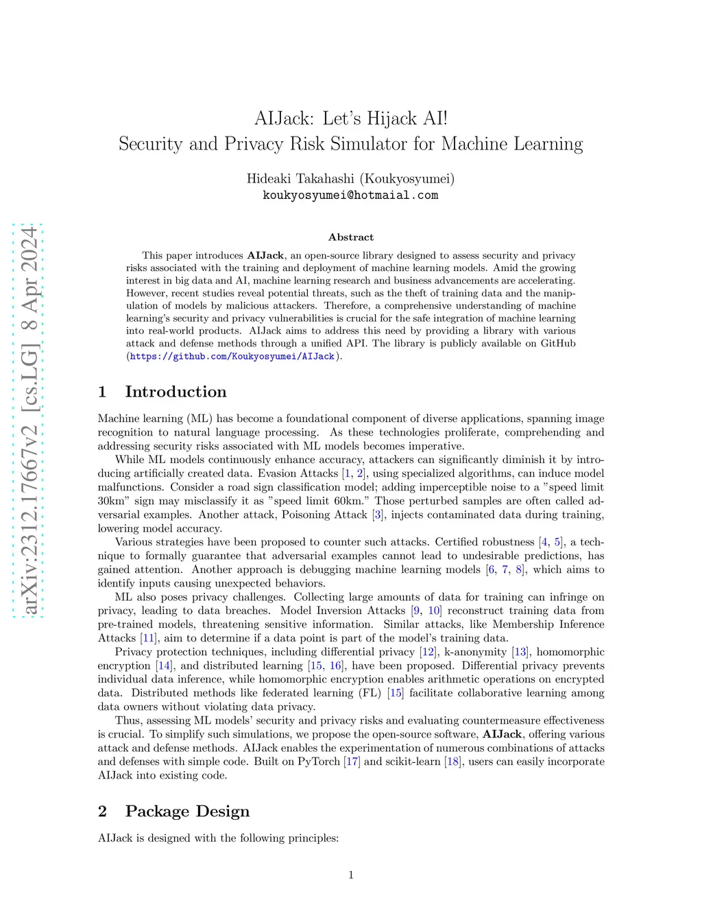 This paper introduces AIJack, an open-source library designed to assess security and privacy risks associated with the training and deployment of machine learning models. Amid the growing interest in big data and AI, advancements in machine learning research and business are accelerating. However, recent studies reveal potential threats, such as the theft of training data and the manipulation of models by malicious attackers. Therefore, a comprehensive understanding of machine learning's security and privacy vulnerabilities is crucial for the safe integration of machine learning into real-world products. AIJack aims to address this need by providing a library with various attack and defense methods through a unified API. The library is publicly available on GitHub (https://github.com/Koukyosyumei/AIJack).