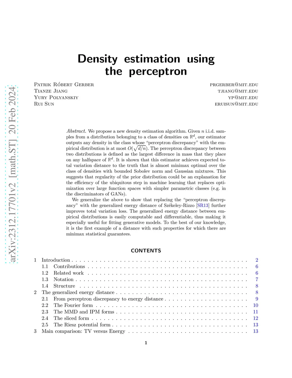 We propose a new density estimation algorithm. Given i.i.d. samples from a distribution belonging to a class of densities on , our estimator outputs any density in the class whose ''perceptron discrepancy'' with the empirical distribution is at most . The perceptron discrepancy between two distributions is defined as the largest difference in mass that they place on any halfspace of . It is shown that this estimator achieves expected total variation distance to the truth that is almost minimax optimal over the class of densities with bounded Sobolev norm and Gaussian mixtures. This suggests that regularity of the prior distribution could be an explanation for the efficiency of the ubiquitous step in machine learning that replaces optimization over large function spaces with simpler parametric classes (e.g. in the discriminators of GANs). We generalize the above to show that replacing the ''perceptron discrepancy'' with the generalized energy distance of Sz\ékeley-Rizzo further improves total variation loss. The generalized energy distance between empirical distributions is easily computable and differentiable, thus making it especially useful for fitting generative models. To the best of our knowledge, it is the first example of a distance with such properties for which there are minimax statistical guarantees.