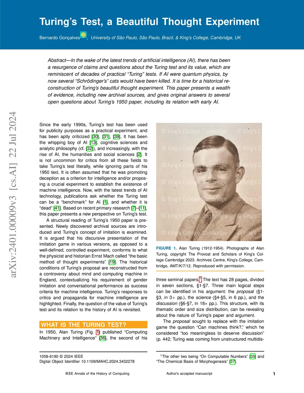 In the wake of large language models, there has been a resurgence of claims and questions about the Turing test and its value for AI, which are reminiscent of decades of practical "Turing" tests. If AI were quantum physics, by now several "Schr\"odinger's" cats could have been killed. Better late than never, it is time for a historical reconstruction of Turing's beautiful thought experiment. In this paper I present a wealth of evidence, including new archival sources, give original answers to several open questions about Turing's 1950 paper, and address the core question of the value of Turing's test.