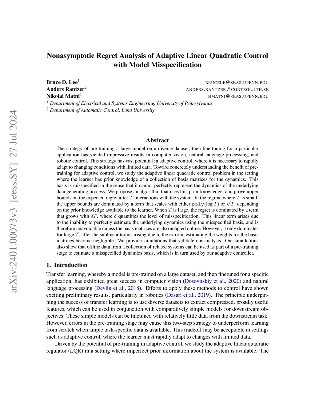 The strategy of pre-training a large model on a diverse dataset, then fine-tuning for a particular application has yielded impressive results in computer vision, natural language processing, and robotic control. This strategy has vast potential in adaptive control, where it is necessary to rapidly adapt to changing conditions with limited data. Toward concretely understanding the benefit of pre-training for adaptive control, we study the adaptive linear quadratic control problem in the setting where the learner has prior knowledge of a collection of basis matrices for the dynamics. This basis is misspecified in the sense that it cannot perfectly represent the dynamics of the underlying data generating process. We propose an algorithm that uses this prior knowledge, and prove upper bounds on the expected regret after interactions with the system. In the regime where is small, the upper bounds are dominated by a term that scales with either or , depending on the prior knowledge available to the learner. When is large, the regret is dominated by a term that grows with , where quantifies the level of misspecification. This linear term arises due to the inability to perfectly estimate the underlying dynamics using the misspecified basis, and is therefore unavoidable unless the basis matrices are also adapted online. However, it only dominates for large , after the sublinear terms arising due to the error in estimating the weights for the basis matrices become negligible. We provide simulations that validate our analysis. Our simulations also show that offline data from a collection of related systems can be used as part of a pre-training stage to estimate a misspecified dynamics basis, which is in turn used by our adaptive controller.