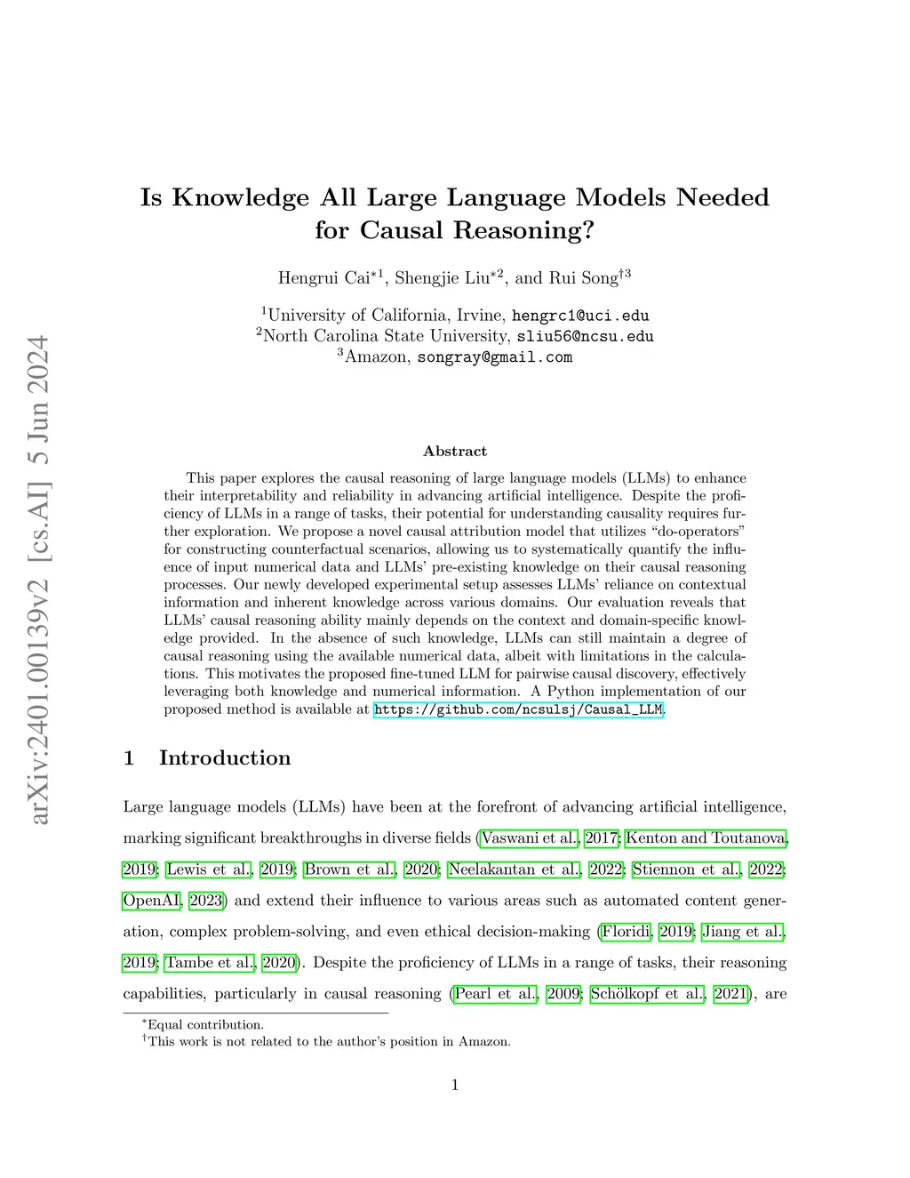 This paper explores the causal reasoning of large language models (LLMs) to enhance their interpretability and reliability in advancing artificial intelligence. Despite the proficiency of LLMs in a range of tasks, their potential for understanding causality requires further exploration. We propose a novel causal attribution model that utilizes ``do-operators" for constructing counterfactual scenarios, allowing us to systematically quantify the influence of input numerical data and LLMs' pre-existing knowledge on their causal reasoning processes. Our newly developed experimental setup assesses LLMs' reliance on contextual information and inherent knowledge across various domains. Our evaluation reveals that LLMs' causal reasoning ability mainly depends on the context and domain-specific knowledge provided. In the absence of such knowledge, LLMs can still maintain a degree of causal reasoning using the available numerical data, albeit with limitations in the calculations. This motivates the proposed fine-tuned LLM for pairwise causal discovery, effectively leveraging both knowledge and numerical information.