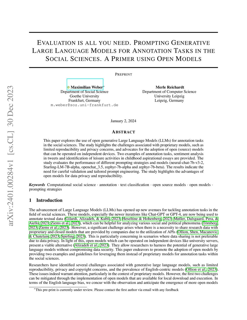 This paper explores the use of open generative Large Language Models (LLMs) for annotation tasks in the social sciences. The study highlights the challenges associated with proprietary models, such as limited reproducibility and privacy concerns, and advocates for the adoption of open (source) models that can be operated on independent devices. Two examples of annotation tasks, sentiment analysis in tweets and identification of leisure activities in childhood aspirational essays are provided. The study evaluates the performance of different prompting strategies and models (neural-chat-7b-v3-2, Starling-LM-7B-alpha, openchat_3.5, zephyr-7b-alpha and zephyr-7b-beta). The results indicate the need for careful validation and tailored prompt engineering. The study highlights the advantages of open models for data privacy and reproducibility.