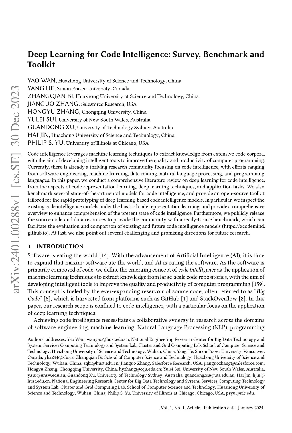 Deep Learning for Code Intelligence: Survey, Benchmark and Toolkit
