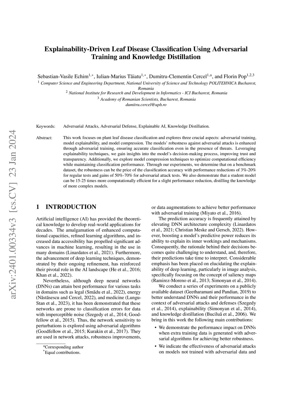 This work focuses on plant leaf disease classification and explores three crucial aspects: adversarial training, model explainability, and model compression. The models' robustness against adversarial attacks is enhanced through adversarial training, ensuring accurate classification even in the presence of threats. Leveraging explainability techniques, we gain insights into the model's decision-making process, improving trust and transparency. Additionally, we explore model compression techniques to optimize computational efficiency while maintaining classification performance. Through our experiments, we determine that on a benchmark dataset, the robustness can be the price of the classification accuracy with performance reductions of 3%-20% for regular tests and gains of 50%-70% for adversarial attack tests. We also demonstrate that a student model can be 15-25 times more computationally efficient for a slight performance reduction, distilling the knowledge of more complex models.