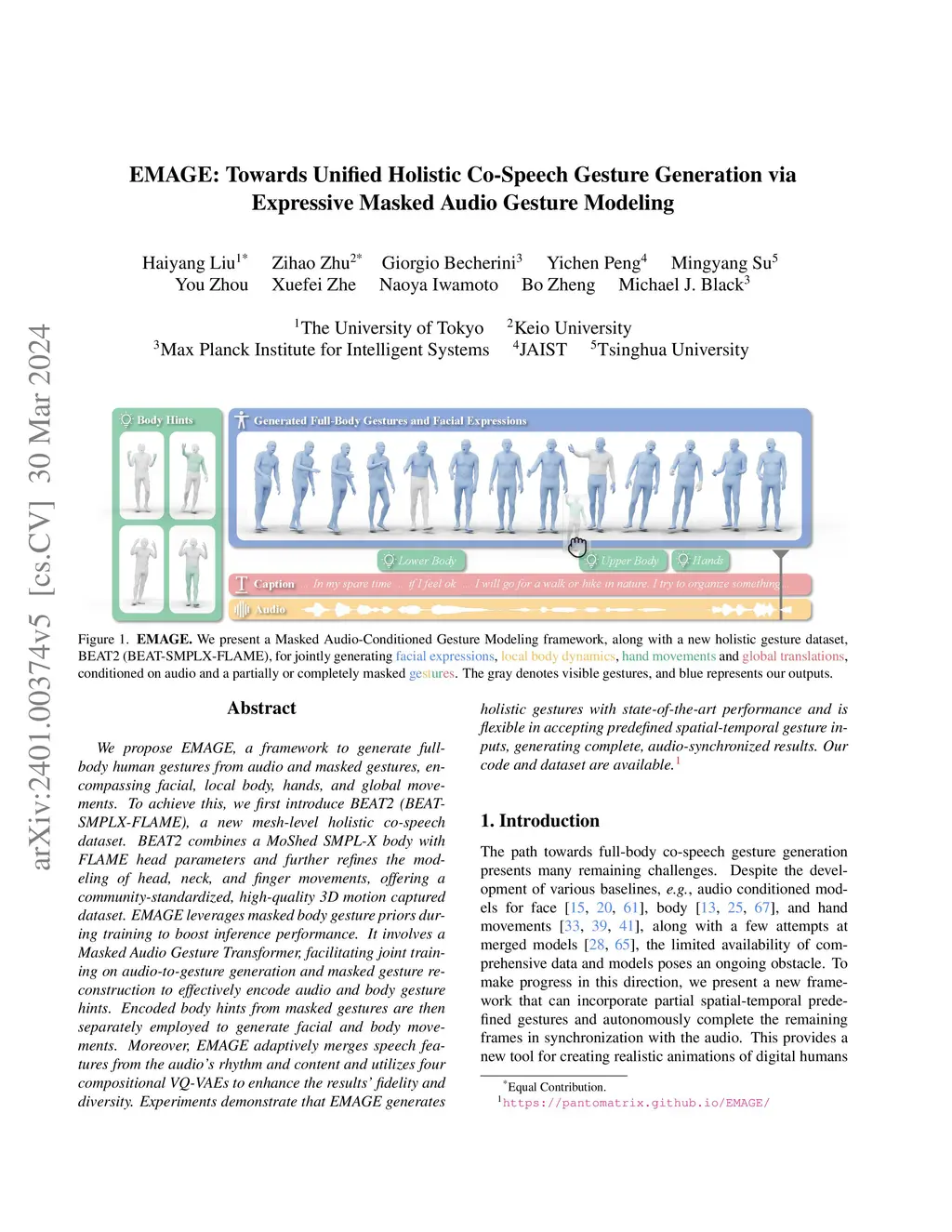We propose EMAGE, a framework to generate full-body human gestures from audio and masked gestures, encompassing facial, local body, hands, and global movements. To achieve this, we first introduce BEAT2 (BEAT-SMPLX-FLAME), a new mesh-level holistic co-speech dataset. BEAT2 combines a MoShed SMPL-X body with FLAME head parameters and further refines the modeling of head, neck, and finger movements, offering a community-standardized, high-quality 3D motion captured dataset. EMAGE leverages masked body gesture priors during training to boost inference performance. It involves a Masked Audio Gesture Transformer, facilitating joint training on audio-to-gesture generation and masked gesture reconstruction to effectively encode audio and body gesture hints. Encoded body hints from masked gestures are then separately employed to generate facial and body movements. Moreover, EMAGE adaptively merges speech features from the audio's rhythm and content and utilizes four compositional VQ-VAEs to enhance the results' fidelity and diversity. Experiments demonstrate that EMAGE generates holistic gestures with state-of-the-art performance and is flexible in accepting predefined spatial-temporal gesture inputs, generating complete, audio-synchronized results. Our code and dataset are available https://pantomatrix.github.io/EMAGE/