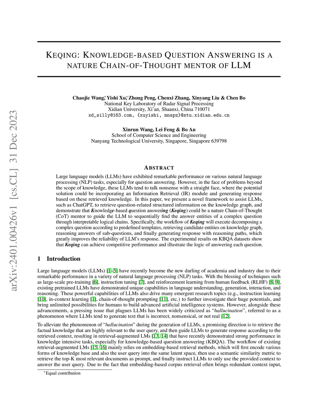 Large language models (LLMs) have exhibited remarkable performance on various natural language processing (NLP) tasks, especially for question answering. However, in the face of problems beyond the scope of knowledge, these LLMs tend to talk nonsense with a straight face, where the potential solution could be incorporating an Information Retrieval (IR) module and generating response based on these retrieved knowledge. In this paper, we present a novel framework to assist LLMs, such as ChatGPT, to retrieve question-related structured information on the knowledge graph, and demonstrate that Knowledge-based question answering (Keqing) could be a nature Chain-of-Thought (CoT) mentor to guide the LLM to sequentially find the answer entities of a complex question through interpretable logical chains. Specifically, the workflow of Keqing will execute decomposing a complex question according to predefined templates, retrieving candidate entities on knowledge graph, reasoning answers of sub-questions, and finally generating response with reasoning paths, which greatly improves the reliability of LLM's response. The experimental results on KBQA datasets show that Keqing can achieve competitive performance and illustrate the logic of answering each question.