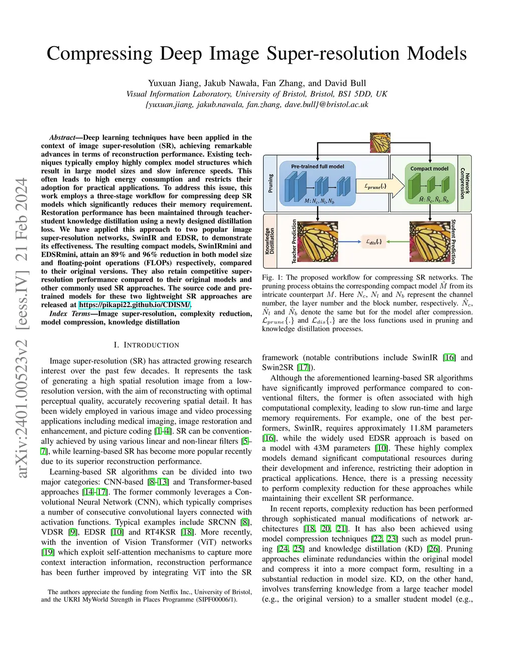 Deep learning techniques have been applied in the context of image super-resolution (SR), achieving remarkable advances in terms of reconstruction performance. Existing techniques typically employ highly complex model structures which result in large model sizes and slow inference speeds. This often leads to high energy consumption and restricts their adoption for practical applications. To address this issue, this work employs a three-stage workflow for compressing deep SR models which significantly reduces their memory requirement. Restoration performance has been maintained through teacher-student knowledge distillation using a newly designed distillation loss. We have applied this approach to two popular image super-resolution networks, SwinIR and EDSR, to demonstrate its effectiveness. The resulting compact models, SwinIRmini and EDSRmini, attain an 89% and 96% reduction in both model size and floating-point operations (FLOPs) respectively, compared to their original versions. They also retain competitive super-resolution performance compared to their original models and other commonly used SR approaches. The source code and pre-trained models for these two lightweight SR approaches are released at https://pikapi22.github.io/CDISM/.