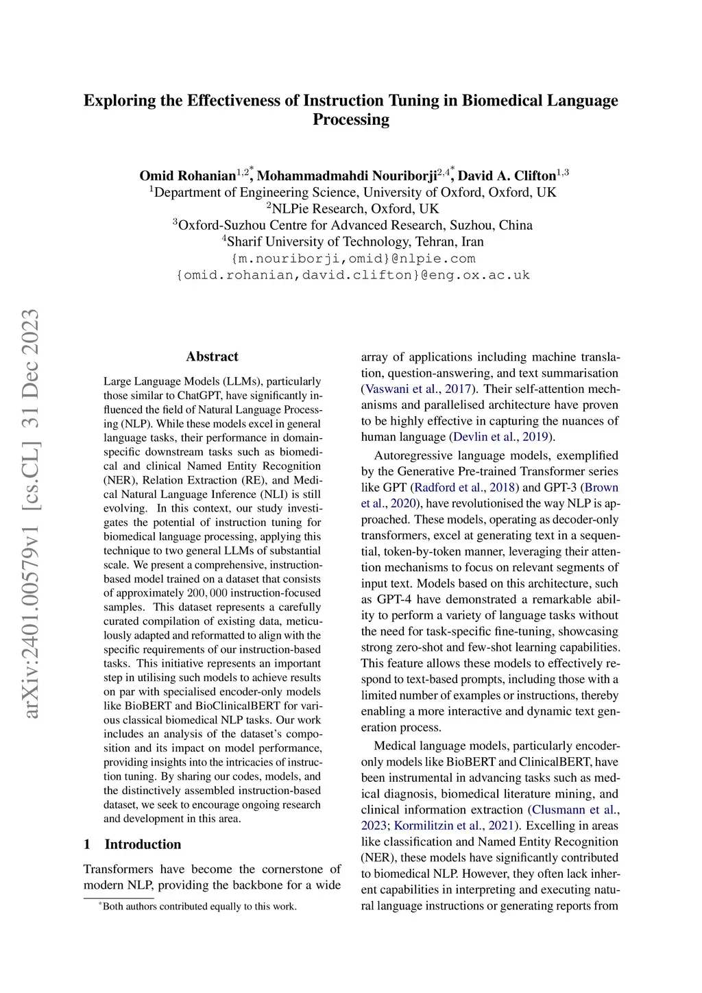 Large Language Models (LLMs), particularly those similar to ChatGPT, have significantly influenced the field of Natural Language Processing (NLP). While these models excel in general language tasks, their performance in domain-specific downstream tasks such as biomedical and clinical Named Entity Recognition (NER), Relation Extraction (RE), and Medical Natural Language Inference (NLI) is still evolving. In this context, our study investigates the potential of instruction tuning for biomedical language processing, applying this technique to two general LLMs of substantial scale. We present a comprehensive, instruction-based model trained on a dataset that consists of approximately instruction-focused samples. This dataset represents a carefully curated compilation of existing data, meticulously adapted and reformatted to align with the specific requirements of our instruction-based tasks. This initiative represents an important step in utilising such models to achieve results on par with specialised encoder-only models like BioBERT and BioClinicalBERT for various classical biomedical NLP tasks. Our work includes an analysis of the dataset's composition and its impact on model performance, providing insights into the intricacies of instruction tuning. By sharing our codes, models, and the distinctively assembled instruction-based dataset, we seek to encourage ongoing research and development in this area.