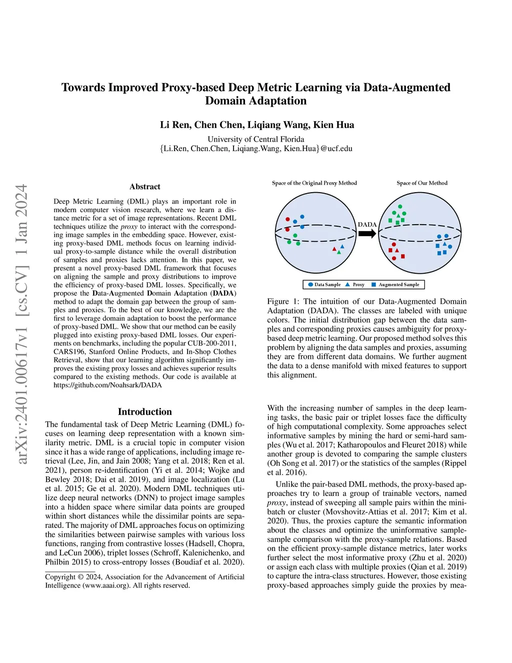 Deep Metric Learning (DML) plays an important role in modern computer vision research, where we learn a distance metric for a set of image representations. Recent DML techniques utilize the proxy to interact with the corresponding image samples in the embedding space. However, existing proxy-based DML methods focus on learning individual proxy-to-sample distance while the overall distribution of samples and proxies lacks attention. In this paper, we present a novel proxy-based DML framework that focuses on aligning the sample and proxy distributions to improve the efficiency of proxy-based DML losses. Specifically, we propose the Data-Augmented Domain Adaptation (DADA) method to adapt the domain gap between the group of samples and proxies. To the best of our knowledge, we are the first to leverage domain adaptation to boost the performance of proxy-based DML. We show that our method can be easily plugged into existing proxy-based DML losses. Our experiments on benchmarks, including the popular CUB-200-2011, CARS196, Stanford Online Products, and In-Shop Clothes Retrieval, show that our learning algorithm significantly improves the existing proxy losses and achieves superior results compared to the existing methods.