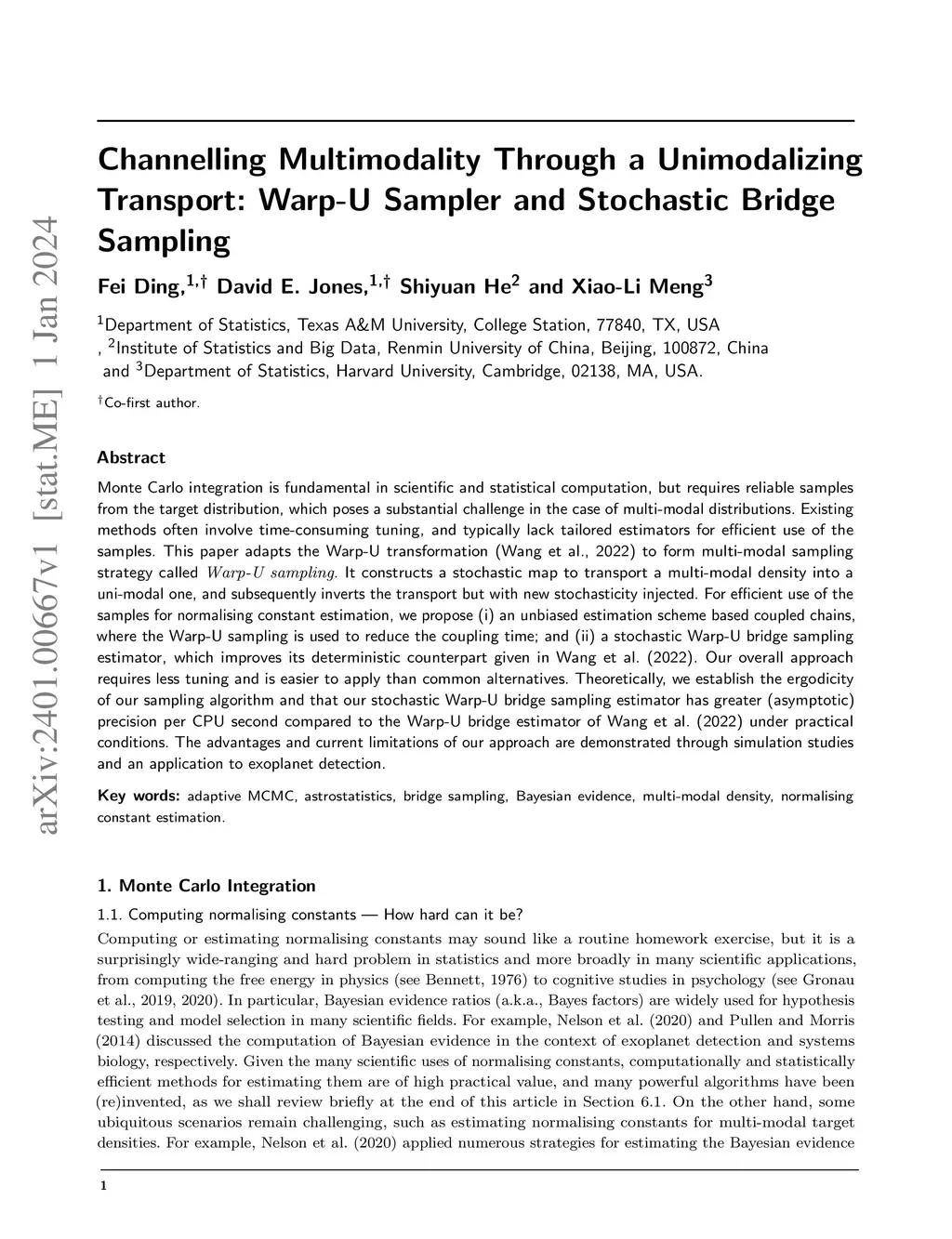Monte Carlo integration is fundamental in scientific and statistical computation, but requires reliable samples from the target distribution, which poses a substantial challenge in the case of multi-modal distributions. Existing methods often involve time-consuming tuning, and typically lack tailored estimators for efficient use of the samples. This paper adapts the Warp-U transformation [Wang et al., 2022] to form multi-modal sampling strategy called Warp-U sampling. It constructs a stochastic map to transport a multi-modal density into a uni-modal one, and subsequently inverts the transport but with new stochasticity injected. For efficient use of the samples for normalising constant estimation, we propose (i) an unbiased estimation scheme based coupled chains, where the Warp-U sampling is used to reduce the coupling time; and (ii) a stochastic Warp-U bridge sampling estimator, which improves its deterministic counterpart given in Wang et al. [2022]. Our overall approach requires less tuning and is easier to apply than common alternatives. Theoretically, we establish the ergodicity of our sampling algorithm and that our stochastic Warp-U bridge sampling estimator has greater (asymptotic) precision per CPU second compared to the Warp-U bridge estimator of Wang et al. [2022] under practical conditions. The advantages and current limitations of our approach are demonstrated through simulation studies and an application to exoplanet detection.
