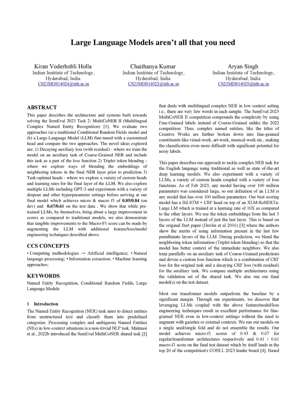 This paper describes the architecture and systems built towards solving the SemEval 2023 Task 2: MultiCoNER II (Multilingual Complex Named Entity Recognition) [1]. We evaluate two approaches (a) a traditional Conditional Random Fields model and (b) a Large Language Model (LLM) fine-tuned with a customized head and compare the two approaches. The novel ideas explored are: 1) Decaying auxiliary loss (with residual) - where we train the model on an auxiliary task of Coarse-Grained NER and include this task as a part of the loss function 2) Triplet token blending - where we explore ways of blending the embeddings of neighboring tokens in the final NER layer prior to prediction 3) Task-optimal heads - where we explore a variety of custom heads and learning rates for the final layer of the LLM. We also explore multiple LLMs including GPT-3 and experiment with a variety of dropout and other hyperparameter settings before arriving at our final model which achieves micro & macro f1 of 0.85/0.84 (on dev) and 0.67/0.61 on the test data . We show that while pre-trained LLMs, by themselves, bring about a large improvement in scores as compared to traditional models, we also demonstrate that tangible improvements to the Macro-F1 score can be made by augmenting the LLM with additional feature/loss/model engineering techniques described above.