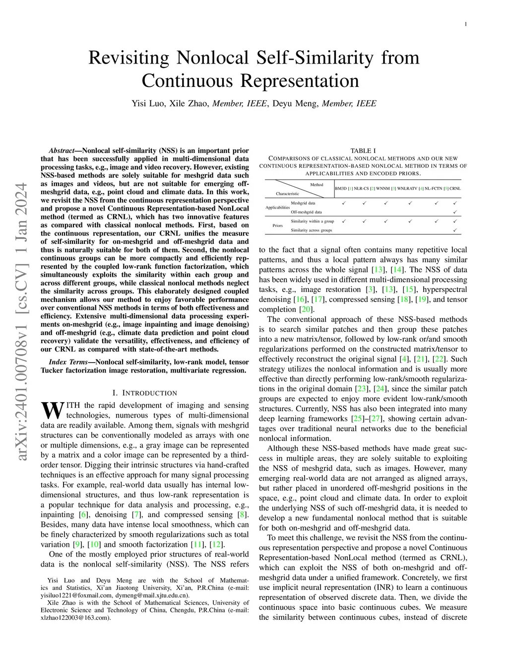 Nonlocal self-similarity (NSS) is an important prior that has been successfully applied in multi-dimensional data processing tasks, e.g., image and video recovery. However, existing NSS-based methods are solely suitable for meshgrid data such as images and videos, but are not suitable for emerging off-meshgrid data, e.g., point cloud and climate data. In this work, we revisit the NSS from the continuous representation perspective and propose a novel Continuous Representation-based NonLocal method (termed as CRNL), which has two innovative features as compared with classical nonlocal methods. First, based on the continuous representation, our CRNL unifies the measure of self-similarity for on-meshgrid and off-meshgrid data and thus is naturally suitable for both of them. Second, the nonlocal continuous groups can be more compactly and efficiently represented by the coupled low-rank function factorization, which simultaneously exploits the similarity within each group and across different groups, while classical nonlocal methods neglect the similarity across groups. This elaborately designed coupled mechanism allows our method to enjoy favorable performance over conventional NSS methods in terms of both effectiveness and efficiency. Extensive multi-dimensional data processing experiments on-meshgrid (e.g., image inpainting and image denoising) and off-meshgrid (e.g., climate data prediction and point cloud recovery) validate the versatility, effectiveness, and efficiency of our CRNL as compared with state-of-the-art methods.