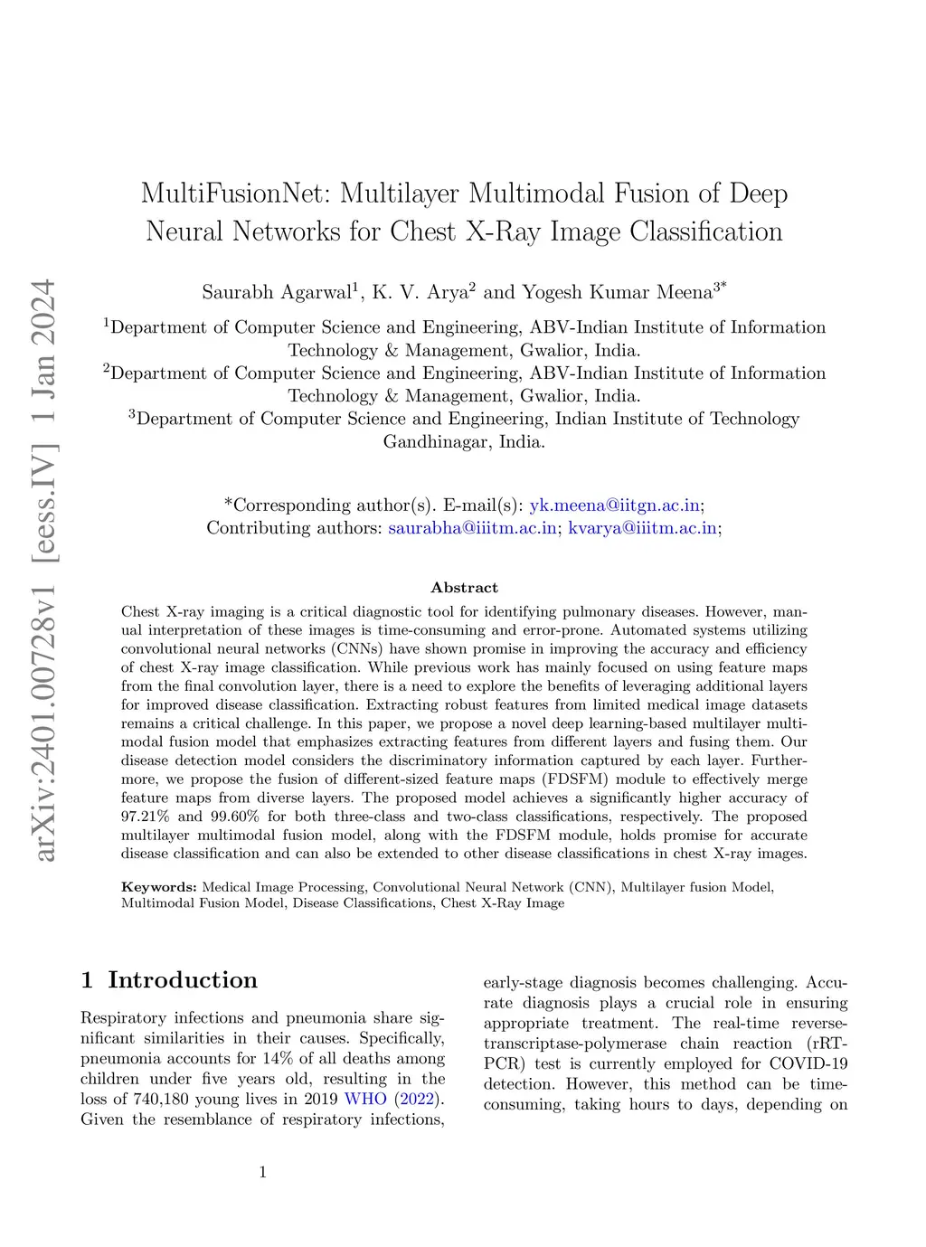 Chest X-ray imaging is a critical diagnostic tool for identifying pulmonary diseases. However, manual interpretation of these images is time-consuming and error-prone. Automated systems utilizing convolutional neural networks (CNNs) have shown promise in improving the accuracy and efficiency of chest X-ray image classification. While previous work has mainly focused on using feature maps from the final convolution layer, there is a need to explore the benefits of leveraging additional layers for improved disease classification. Extracting robust features from limited medical image datasets remains a critical challenge. In this paper, we propose a novel deep learning-based multilayer multimodal fusion model that emphasizes extracting features from different layers and fusing them. Our disease detection model considers the discriminatory information captured by each layer. Furthermore, we propose the fusion of different-sized feature maps (FDSFM) module to effectively merge feature maps from diverse layers. The proposed model achieves a significantly higher accuracy of 97.21% and 99.60% for both three-class and two-class classifications, respectively. The proposed multilayer multimodal fusion model, along with the FDSFM module, holds promise for accurate disease classification and can also be extended to other disease classifications in chest X-ray images.