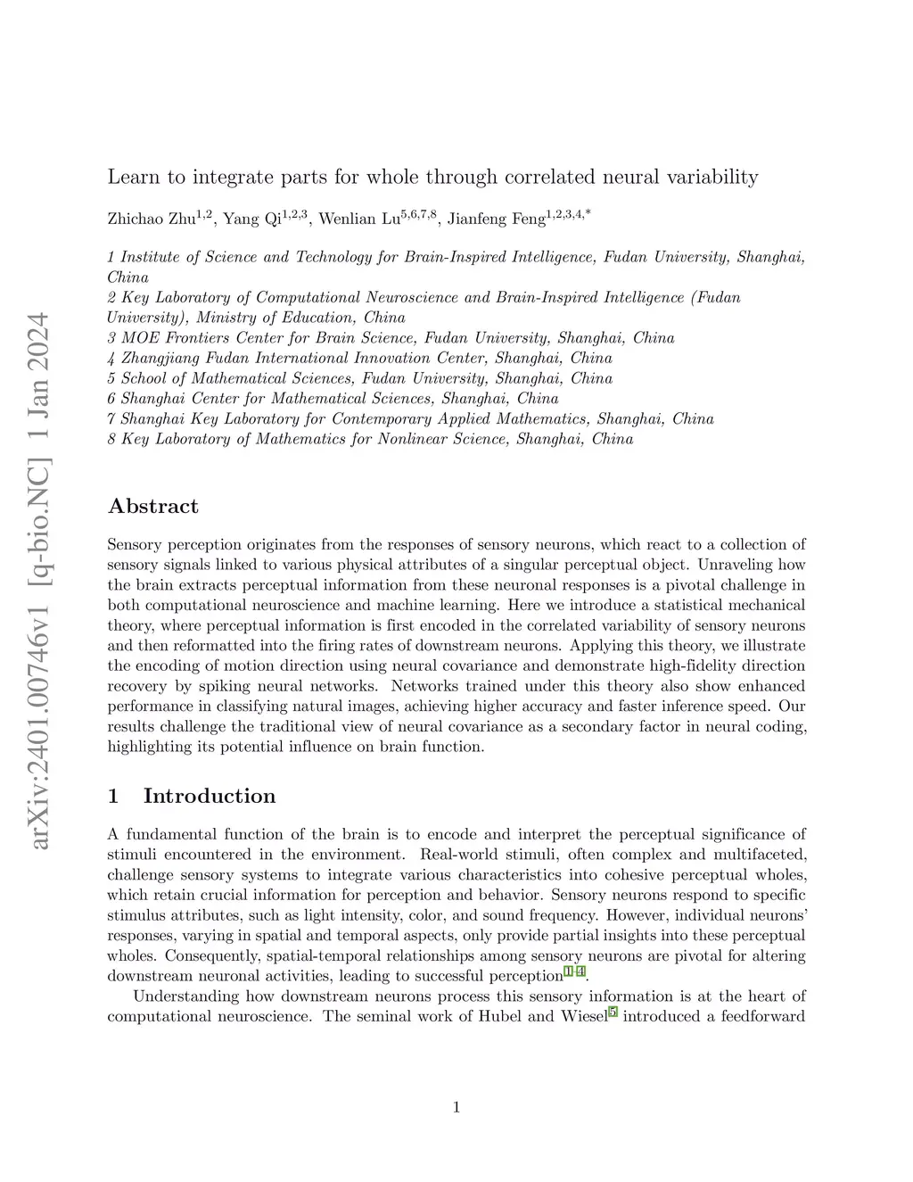 Sensory perception originates from the responses of sensory neurons, which react to a collection of sensory signals linked to various physical attributes of a singular perceptual object. Unraveling how the brain extracts perceptual information from these neuronal responses is a pivotal challenge in both computational neuroscience and machine learning. Here we introduce a statistical mechanical theory, where perceptual information is first encoded in the correlated variability of sensory neurons and then reformatted into the firing rates of downstream neurons. Applying this theory, we illustrate the encoding of motion direction using neural covariance and demonstrate high-fidelity direction recovery by spiking neural networks. Networks trained under this theory also show enhanced performance in classifying natural images, achieving higher accuracy and faster inference speed. Our results challenge the traditional view of neural covariance as a secondary factor in neural coding, highlighting its potential influence on brain function.