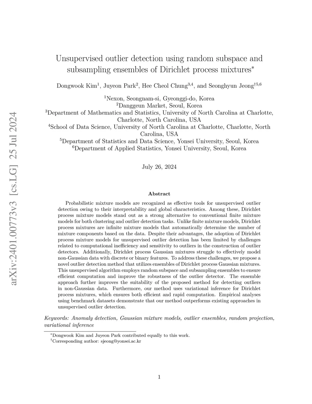 Probabilistic mixture models are acknowledged as a valuable tool for unsupervised outlier detection owing to their interpretability and intuitive grounding in statistical principles. Within this framework, Dirichlet process mixture models emerge as a compelling alternative to conventional finite mixture models for both clustering and outlier detection tasks. However, despite their evident advantages, the widespread adoption of Dirichlet process mixture models in unsupervised outlier detection has been hampered by challenges related to computational inefficiency and sensitivity to outliers during the construction of detectors. To tackle these challenges, we propose a novel outlier detection method based on ensembles of Dirichlet process Gaussian mixtures. The proposed method is a fully unsupervised algorithm that capitalizes on random subspace and subsampling ensembles, not only ensuring efficient computation but also enhancing the robustness of the resulting outlier detector. Moreover, the proposed method leverages variational inference for Dirichlet process mixtures to ensure efficient and fast computation. Empirical studies with benchmark datasets demonstrate that our method outperforms existing approaches for unsupervised outlier detection.