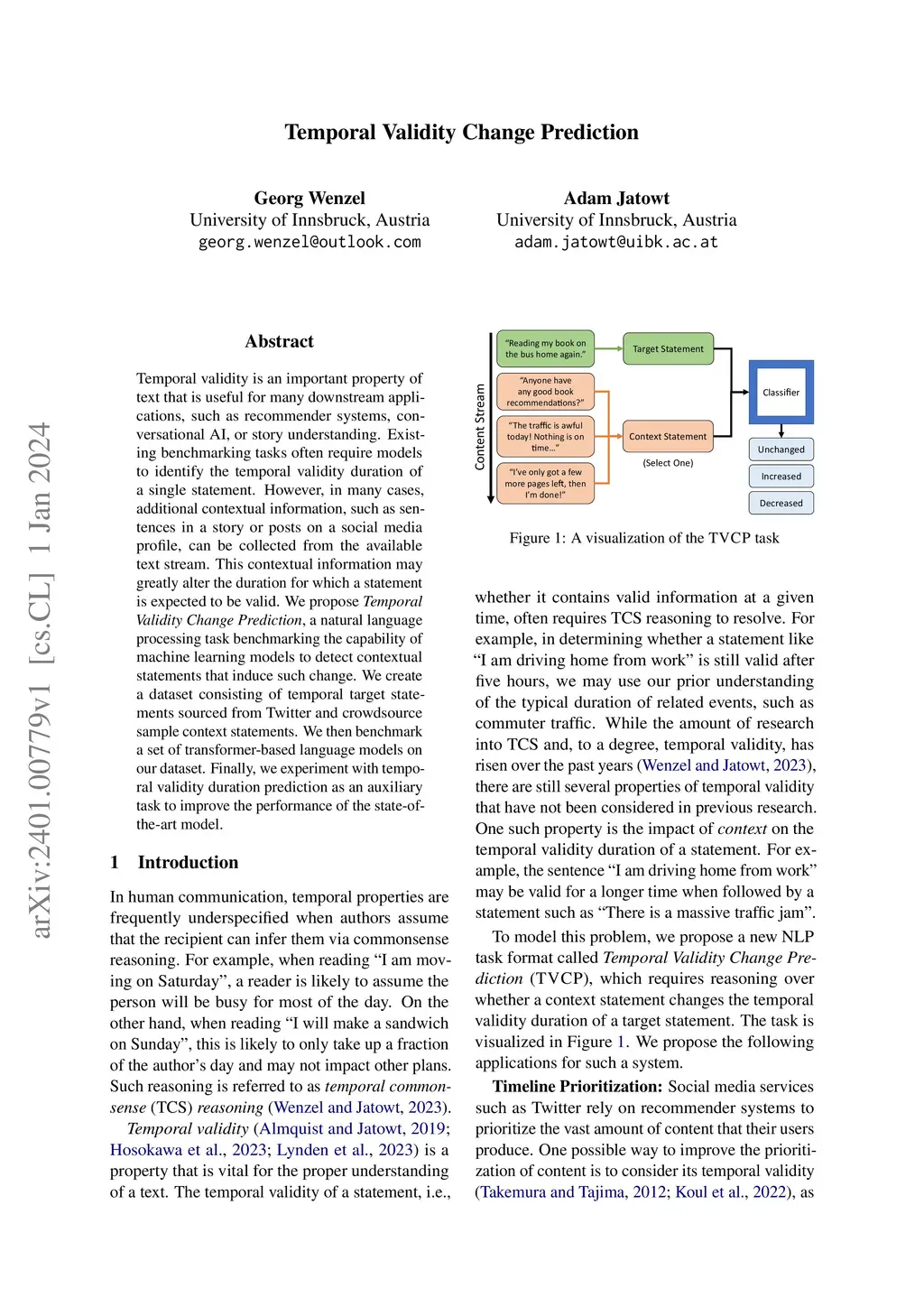 Temporal validity is an important property of text that is useful for many downstream applications, such as recommender systems, conversational AI, or story understanding. Existing benchmarking tasks often require models to identify the temporal validity duration of a single statement. However, in many cases, additional contextual information, such as sentences in a story or posts on a social media profile, can be collected from the available text stream. This contextual information may greatly alter the duration for which a statement is expected to be valid. We propose Temporal Validity Change Prediction, a natural language processing task benchmarking the capability of machine learning models to detect contextual statements that induce such change. We create a dataset consisting of temporal target statements sourced from Twitter and crowdsource sample context statements. We then benchmark a set of transformer-based language models on our dataset. Finally, we experiment with temporal validity duration prediction as an auxiliary task to improve the performance of the state-of-the-art model.