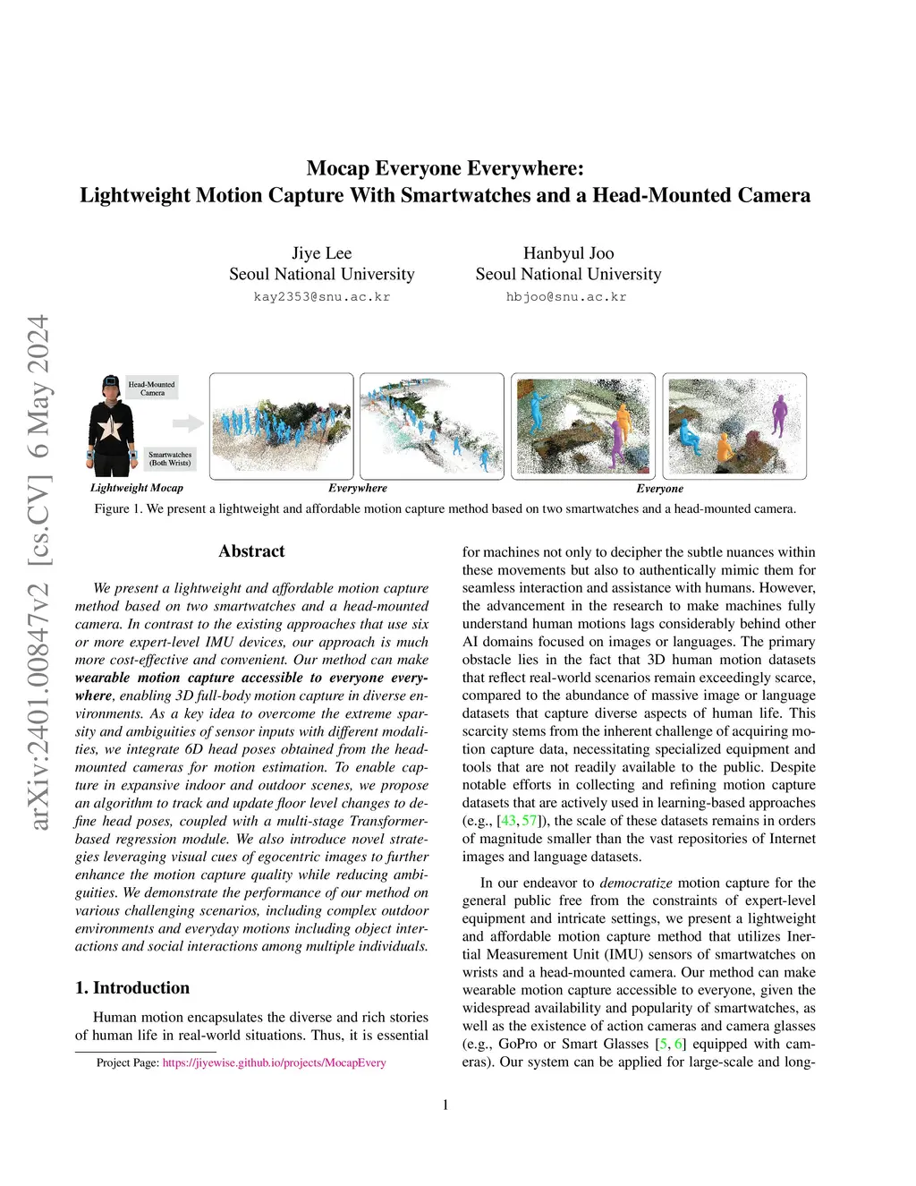 We present a lightweight and affordable motion capture method based on two smartwatches and a head-mounted camera. In contrast to the existing approaches that use six or more expert-level IMU devices, our approach is much more cost-effective and convenient. Our method can make wearable motion capture accessible to everyone everywhere, enabling 3D full-body motion capture in diverse environments. As a key idea to overcome the extreme sparsity and ambiguities of sensor inputs with different modalities, we integrate 6D head poses obtained from the head-mounted cameras for motion estimation. To enable capture in expansive indoor and outdoor scenes, we propose an algorithm to track and update floor level changes to define head poses, coupled with a multi-stage Transformer-based regression module. We also introduce novel strategies leveraging visual cues of egocentric images to further enhance the motion capture quality while reducing ambiguities. We demonstrate the performance of our method on various challenging scenarios, including complex outdoor environments and everyday motions including object interactions and social interactions among multiple individuals.