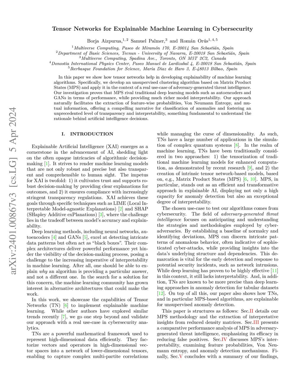 In this paper we show how tensor networks help in developing explainability of machine learning algorithms. Specifically, we develop an unsupervised clustering algorithm based on Matrix Product States (MPS) and apply it in the context of a real use-case of adversary-generated threat intelligence. Our investigation proves that MPS rival traditional deep learning models such as autoencoders and GANs in terms of performance, while providing much richer model interpretability. Our approach naturally facilitates the extraction of feature-wise probabilities, Von Neumann Entropy, and mutual information, offering a compelling narrative for classification of anomalies and fostering an unprecedented level of transparency and interpretability, something fundamental to understand the rationale behind artificial intelligence decisions.