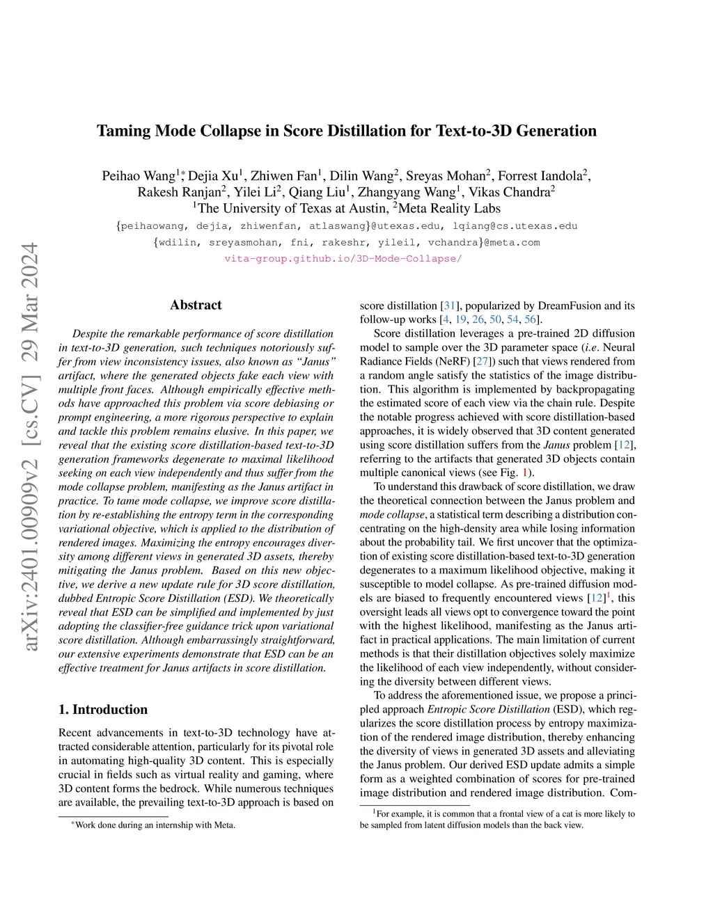 Despite the remarkable performance of score distillation in text-to-3D generation, such techniques notoriously suffer from view inconsistency issues, also known as "Janus" artifact, where the generated objects fake each view with multiple front faces. Although empirically effective methods have approached this problem via score debiasing or prompt engineering, a more rigorous perspective to explain and tackle this problem remains elusive. In this paper, we reveal that the existing score distillation-based text-to-3D generation frameworks degenerate to maximal likelihood seeking on each view independently and thus suffer from the mode collapse problem, manifesting as the Janus artifact in practice. To tame mode collapse, we improve score distillation by re-establishing the entropy term in the corresponding variational objective, which is applied to the distribution of rendered images. Maximizing the entropy encourages diversity among different views in generated 3D assets, thereby mitigating the Janus problem. Based on this new objective, we derive a new update rule for 3D score distillation, dubbed Entropic Score Distillation (ESD). We theoretically reveal that ESD can be simplified and implemented by just adopting the classifier-free guidance trick upon variational score distillation. Although embarrassingly straightforward, our extensive experiments successfully demonstrate that ESD can be an effective treatment for Janus artifacts in score distillation.