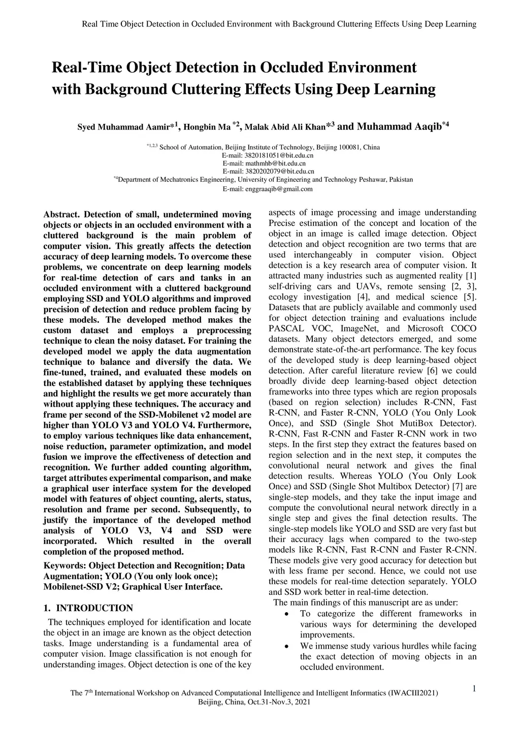 Detection of small, undetermined moving objects or objects in an occluded environment with a cluttered background is the main problem of computer vision. This greatly affects the detection accuracy of deep learning models. To overcome these problems, we concentrate on deep learning models for real-time detection of cars and tanks in an occluded environment with a cluttered background employing SSD and YOLO algorithms and improved precision of detection and reduce problems faced by these models. The developed method makes the custom dataset and employs a preprocessing technique to clean the noisy dataset. For training the developed model we apply the data augmentation technique to balance and diversify the data. We fine-tuned, trained, and evaluated these models on the established dataset by applying these techniques and highlighting the results we got more accurately than without applying these techniques. The accuracy and frame per second of the SSD-Mobilenet v2 model are higher than YOLO V3 and YOLO V4. Furthermore, by employing various techniques like data enhancement, noise reduction, parameter optimization, and model fusion we improve the effectiveness of detection and recognition. We further added a counting algorithm, and target attributes experimental comparison, and made a graphical user interface system for the developed model with features of object counting, alerts, status, resolution, and frame per second. Subsequently, to justify the importance of the developed method analysis of YOLO V3, V4, and SSD were incorporated. Which resulted in the overall completion of the proposed method.