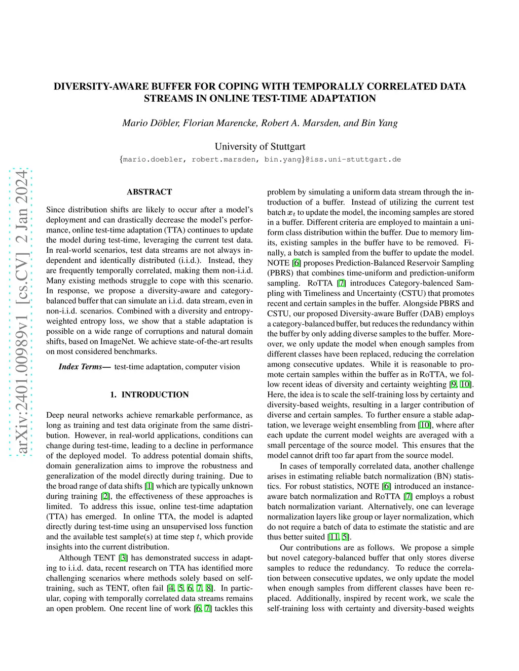 Since distribution shifts are likely to occur after a model's deployment and can drastically decrease the model's performance, online test-time adaptation (TTA) continues to update the model during test-time, leveraging the current test data. In real-world scenarios, test data streams are not always independent and identically distributed (i.i.d.). Instead, they are frequently temporally correlated, making them non-i.i.d. Many existing methods struggle to cope with this scenario. In response, we propose a diversity-aware and category-balanced buffer that can simulate an i.i.d. data stream, even in non-i.i.d. scenarios. Combined with a diversity and entropy-weighted entropy loss, we show that a stable adaptation is possible on a wide range of corruptions and natural domain shifts, based on ImageNet. We achieve state-of-the-art results on most considered benchmarks.