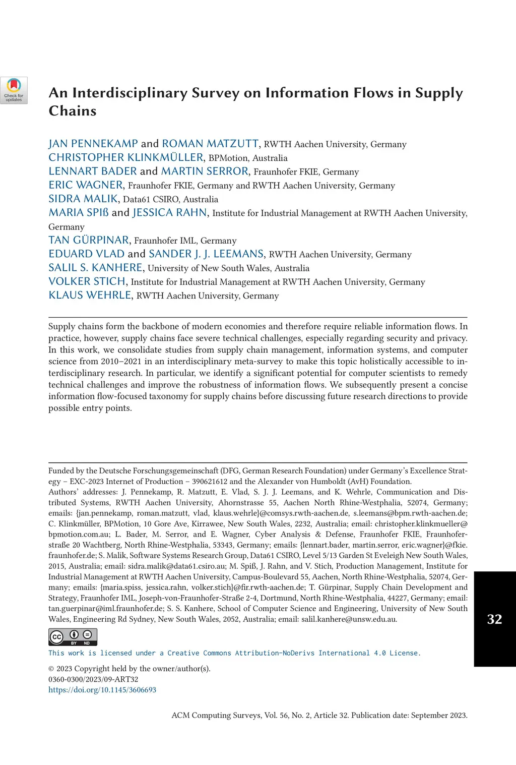 Supply chains form the backbone of modern economies and therefore require reliable information flows. In practice, however, supply chains face severe technical challenges, especially regarding security and privacy. In this work, we consolidate studies from supply chain management, information systems, and computer science from 2010-2021 in an interdisciplinary meta-survey to make this topic holistically accessible to interdisciplinary research. In particular, we identify a significant potential for computer scientists to remedy technical challenges and improve the robustness of information flows. We subsequently present a concise information flow-focused taxonomy for supply chains before discussing future research directions to provide possible entry points.
