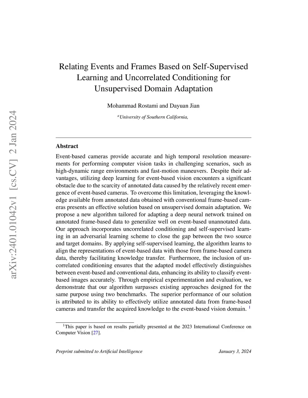Event-based cameras provide accurate and high temporal resolution measurements for performing computer vision tasks in challenging scenarios, such as high-dynamic range environments and fast-motion maneuvers. Despite their advantages, utilizing deep learning for event-based vision encounters a significant obstacle due to the scarcity of annotated data caused by the relatively recent emergence of event-based cameras. To overcome this limitation, leveraging the knowledge available from annotated data obtained with conventional frame-based cameras presents an effective solution based on unsupervised domain adaptation. We propose a new algorithm tailored for adapting a deep neural network trained on annotated frame-based data to generalize well on event-based unannotated data. Our approach incorporates uncorrelated conditioning and self-supervised learning in an adversarial learning scheme to close the gap between the two source and target domains. By applying self-supervised learning, the algorithm learns to align the representations of event-based data with those from frame-based camera data, thereby facilitating knowledgethis http URL, the inclusion of uncorrelated conditioning ensures that the adapted model effectively distinguishes between event-based and conventional data, enhancing its ability to classify event-based imagesthis http URLempirical experimentation and evaluation, we demonstrate that our algorithm surpasses existing approaches designed for the same purpose using two benchmarks. The superior performance of our solution is attributed to its ability to effectively utilize annotated data from frame-based cameras and transfer the acquired knowledge to the event-based vision domain.